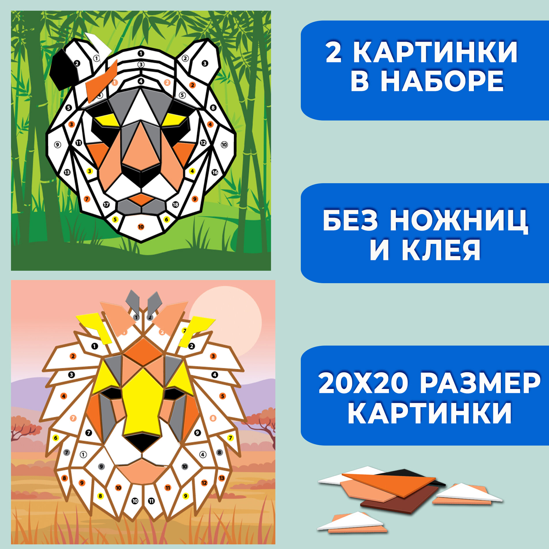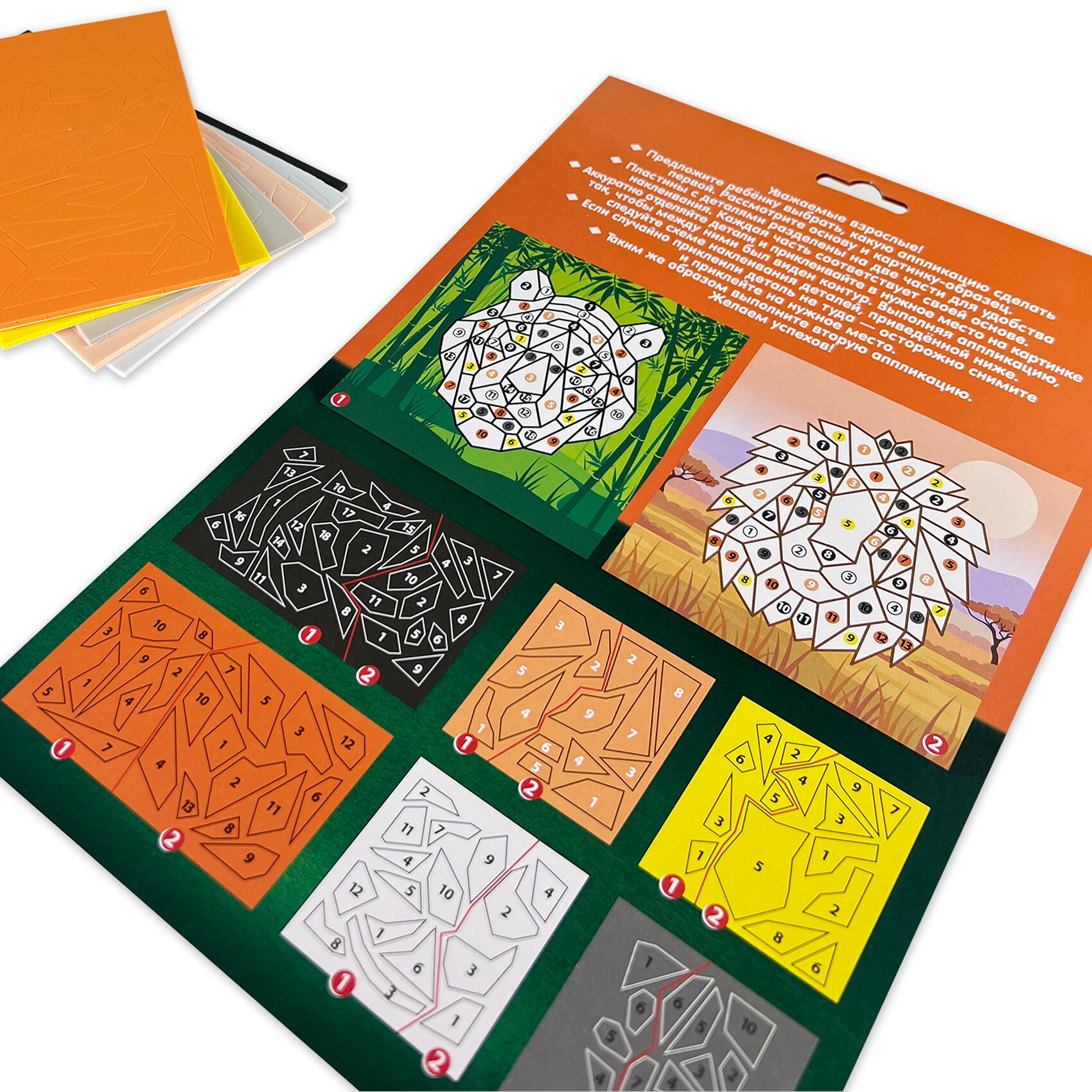 В наборе: 2 цветные основы со схемой размещения деталей, детали из ЭВА на самоклеящейся основе, цветная листовка-образец.