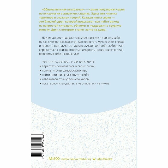 "Обнимательная психология" - самая популярная серия по психологии в азиатских странах. Здесь нет лишних терминов и сложных теорий. Каждая книга серии - это близкий друг, который подскажет, как найти выход из трудной ситуации. Обнимет и поддержит в трудную минуту. Рядом с которым станет легче.