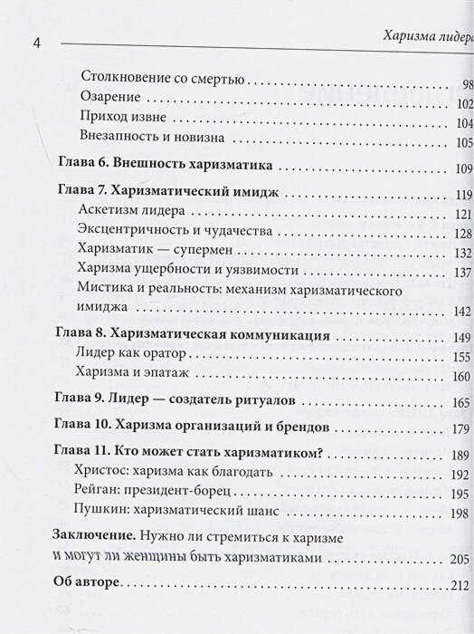 Харизма рассматривается как одна из составляющих лидерства. Книга знакомит читателей с картиной внутреннего мира выдающихся людей, с фактами из биографий наиболее известных харизматических фигур прошлого и настоящего — и дает возможность соотнести себя с ними.