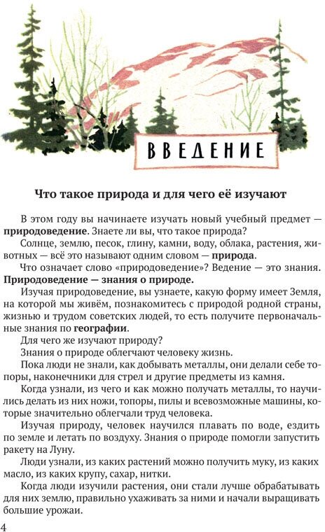 Учебное пособие по природоведению предназначено для школьников 4 класса и раскрывает общие вопросы устройства окружающего мира. Учащиеся узнают, какую форму имеет Земля, познакомятся с природой родной страны, жизнью и трудом советских людей, а также получат первоначальные знания по географии, геологии, физике и биологии. Материалы учебника содержат подробные краеведческие описания различных климатических зон нашей страны и хозяйственной деятельности населения. Немалое внимание в издании уделено охране здоровья человека: строению организма, правилам личной гигиены, формированию полезных привычек. Книга отличается наличием практических упражнений к каждой главе. Для их выполнения понадобятся контурные карты, личные наблюдения учащихся и проведение элементарных опытов. Для удобства восприятия и закрепления новой информации издание снабжено иллюстрациями, схемами и примерами выполненных работ. Приложение содержит карты мира и СССР, на основе которых интересно проследить экономические и политические изменения, произошедшие после первого издания учебника. Книга предназначена для детей младшего школьного возраста и пригодится как учителям и репетиторам, так и родителям для дополнительных занятий.