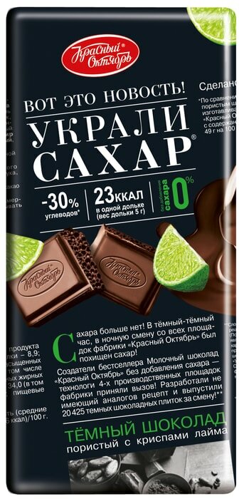 Шоколад темный пористый красный октябрь Украли сахар, с хрустящими криспами из лайма приготовлен без сахара. В составе только натуральные ингредиенты, создан для ценителей темного шоколада. Без вреда для фигуры: меньше углеводов на 30%, а в одной дольке шоколада всего 23 кКал. Без интенсивных подсластителей, без вреда для ЖКТ. Отличное начало дня с чашечкой кофе!