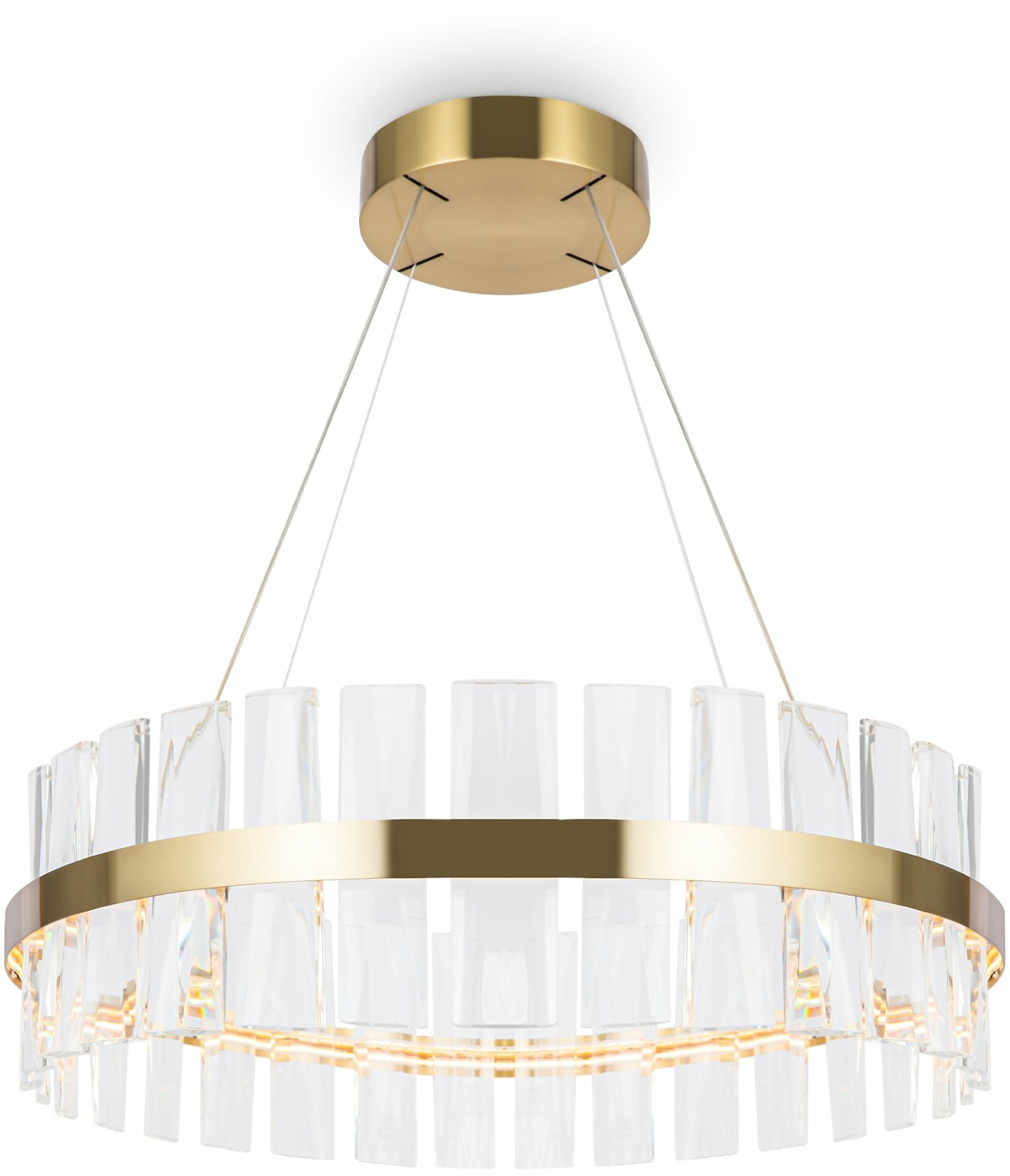 Материал арматуры - металл, цвет - латунь. Декор - объемные прозрачные хрустальные элементы с чередующимся рисунком. LED источник света, цветовая температура - 3000К. Регулируемая длина тросов.