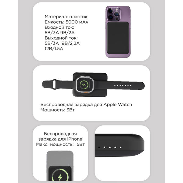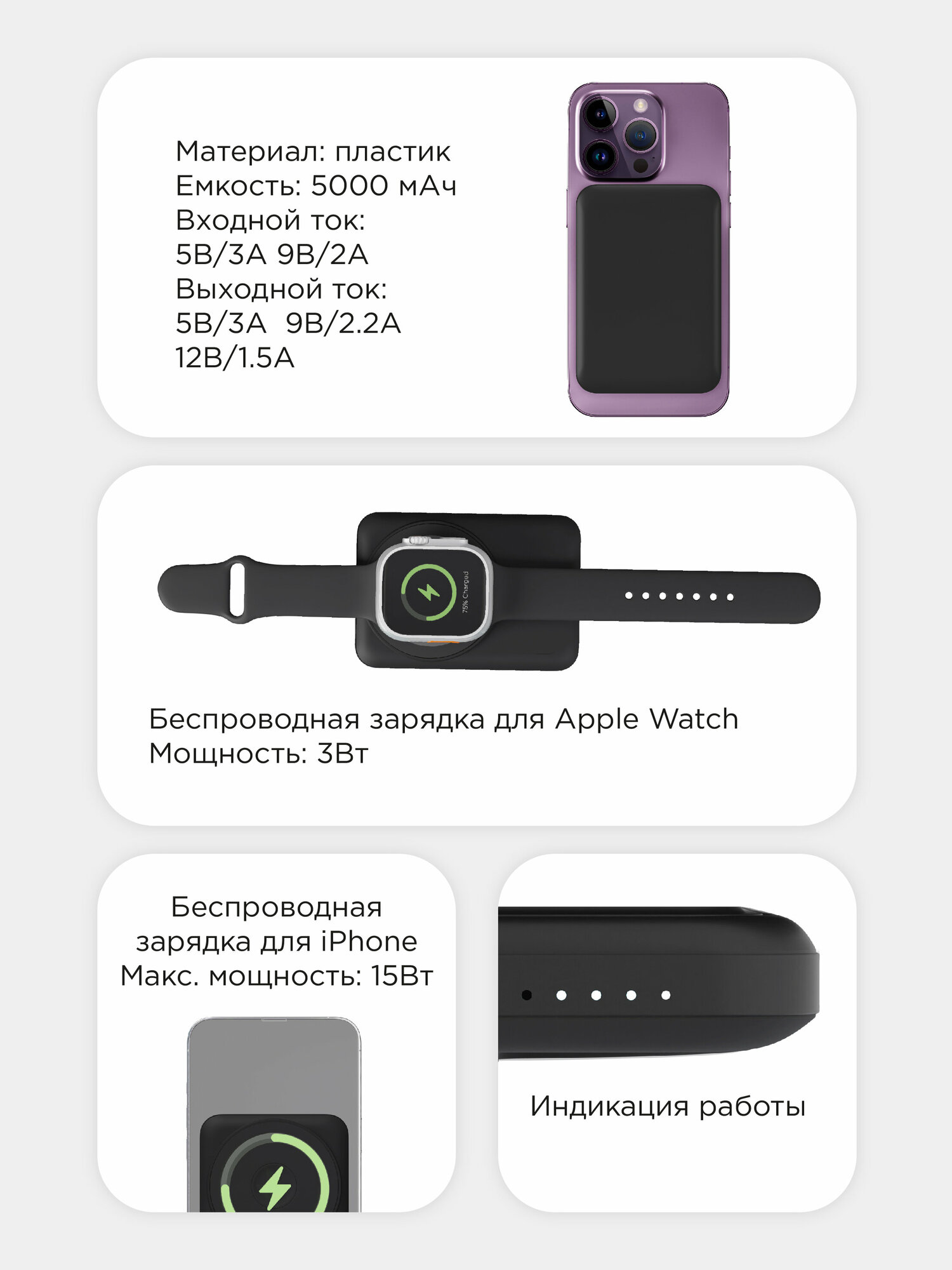 Компактный и ультратонкий аккумулятор с функцией MagSafe. Поддерживает беспроводную зарядку максимальной мощностью 15Вт для смартфонов и 3Вт для Apple Watch. Наличие световой индикации позволяет определить уровень работы аккумулятора. Выход Type-C и кабель в комплекте обеспечивает быструю проводную зарядку Power Delivery. Совместимость: Apple iPhone (с 12 серии), смартфоны с поддержкой беспроводной зарядки в чехлах MagSafe, часы Apple Watch и устройства с возможностью зарядки от порта USB.