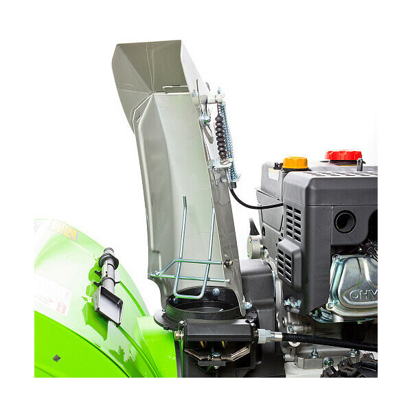 - Большая дальность выброса - позволяет отбрасывать снег за пределы участка, настраивая поворот желоба