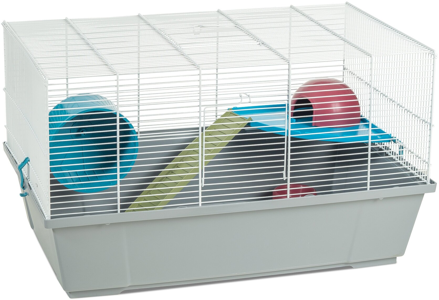 Высокий пластиковый поддон предотвращает разбрасывание наполнителя или мелкого мусора за пределы клетки и создает для маленького обитателя атмосферу уюта и защищенности. Для свободного доступа к зверьку и ежедневной уборки есть две дверки: одна располагается в верхней части решетки на «потолке», вторая находится на передней стенке клетки. В случае необходимости поменять наполнитель или провести генеральную уборку клетка легко и просто разбирается — пластиковая основа присоединяется к верхней части с помощью двух защелок. Решетка на дне поддона не предусмотрена, а значит, ваш любимец не рискует повредить лапку или хвост даже при самых смелых маневрах.