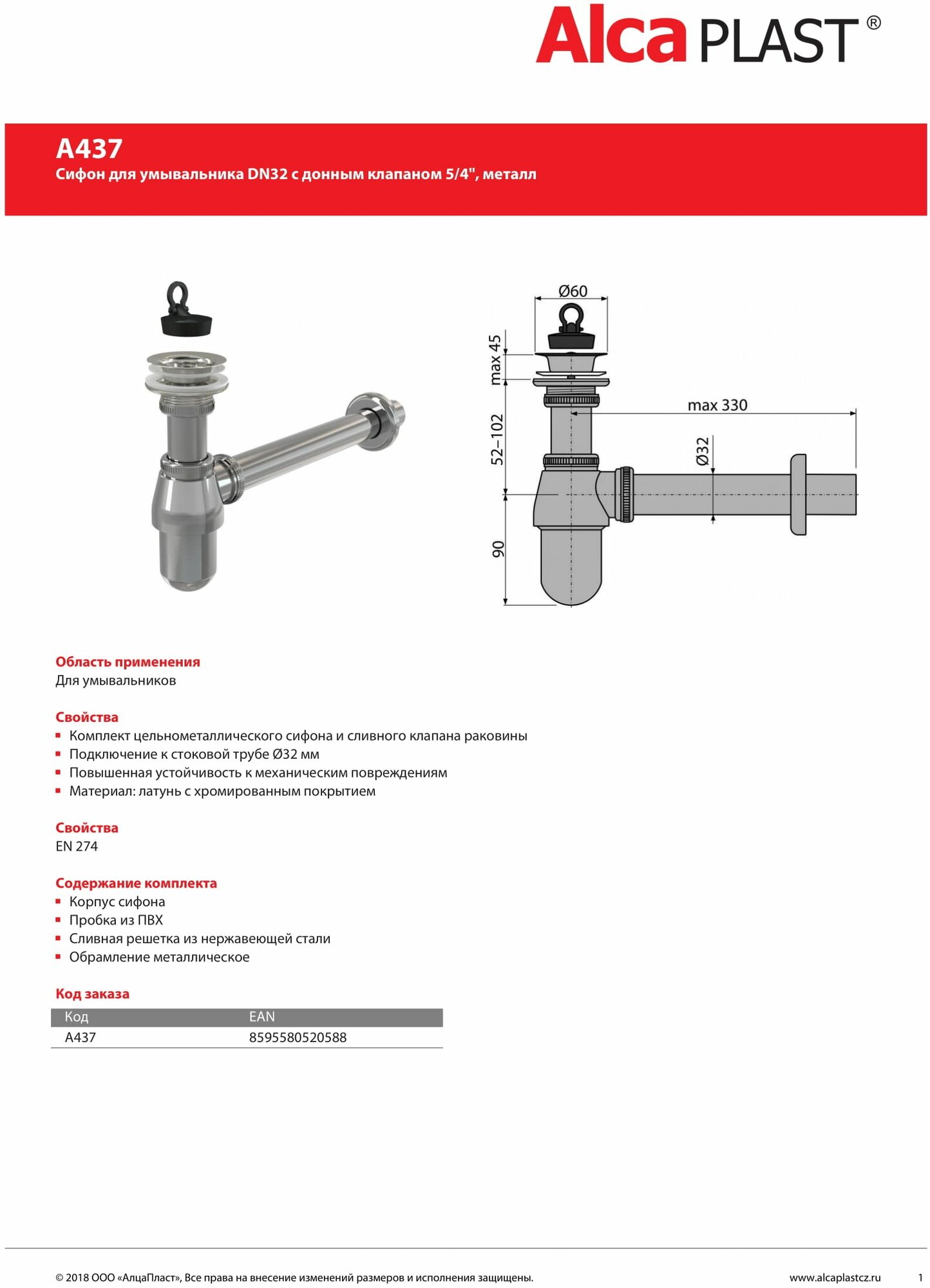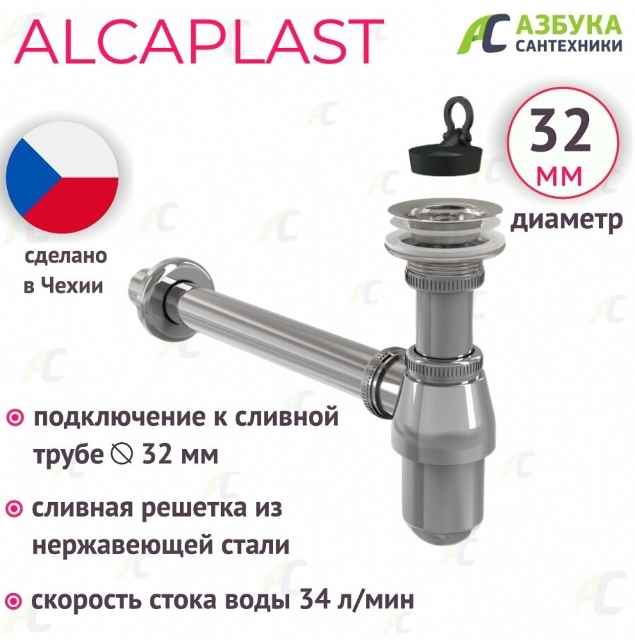 Сифон для раковины AlcaPlast 32, цельнометрический () Компания Alcaplast была основана в 1998 году, как частная чешская компания. Alcaplast является крупнейшим производителем сантехники в Центральной и Восточной Европе. и производит более 580 продуктов – впускные и выпускные механизмы, сифоны, системы инсталляции, желоба, сливные трапы, сиденья для унитаза и другие продукты.