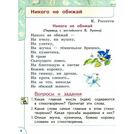 Система вопросов и заданий способствует формированию у младших школьников культуры речевого общения, развитию творческих способностей. Тексты классической и современной литературы, фольклорные произведения разных народов представлены в системе для восприятия и осмысления культурно-исторического наследия, а также для развития любви к чтению.