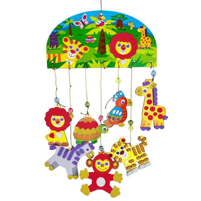 В комплекте: подвеска, 7 фигурок из картона, детали из мягкого пластика ЭВА (матовые и блестящие) на самоклеящейся основе, бусины, декоративная нить.