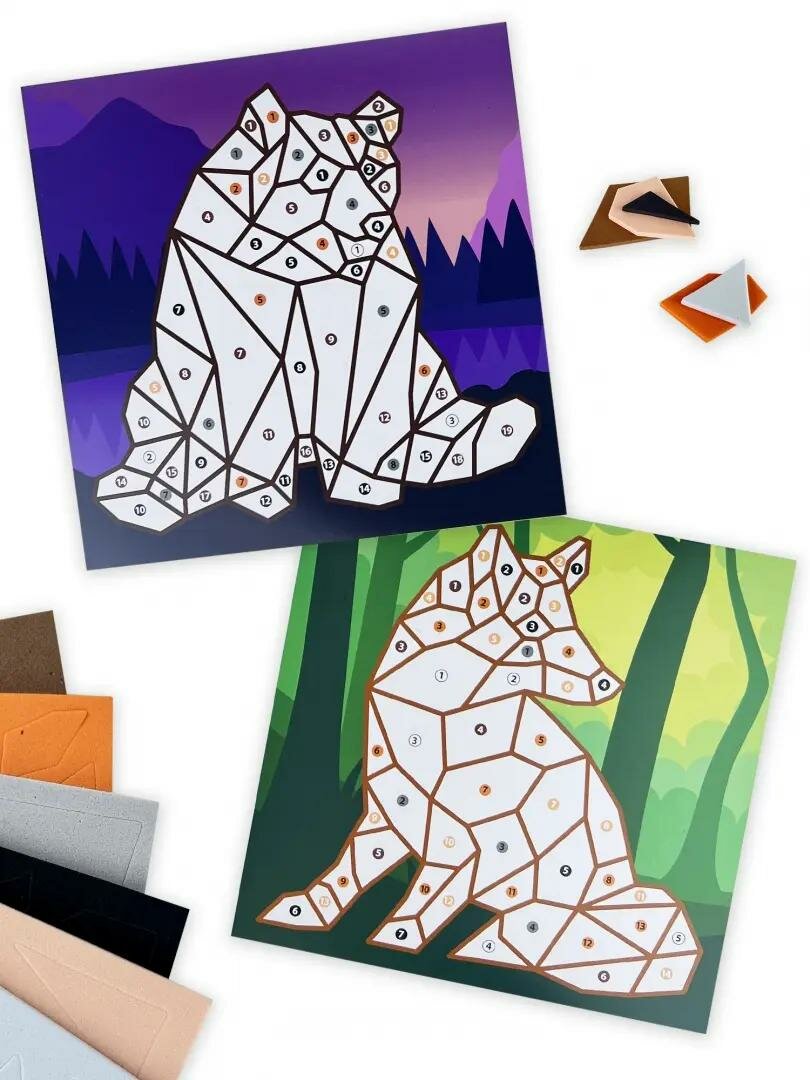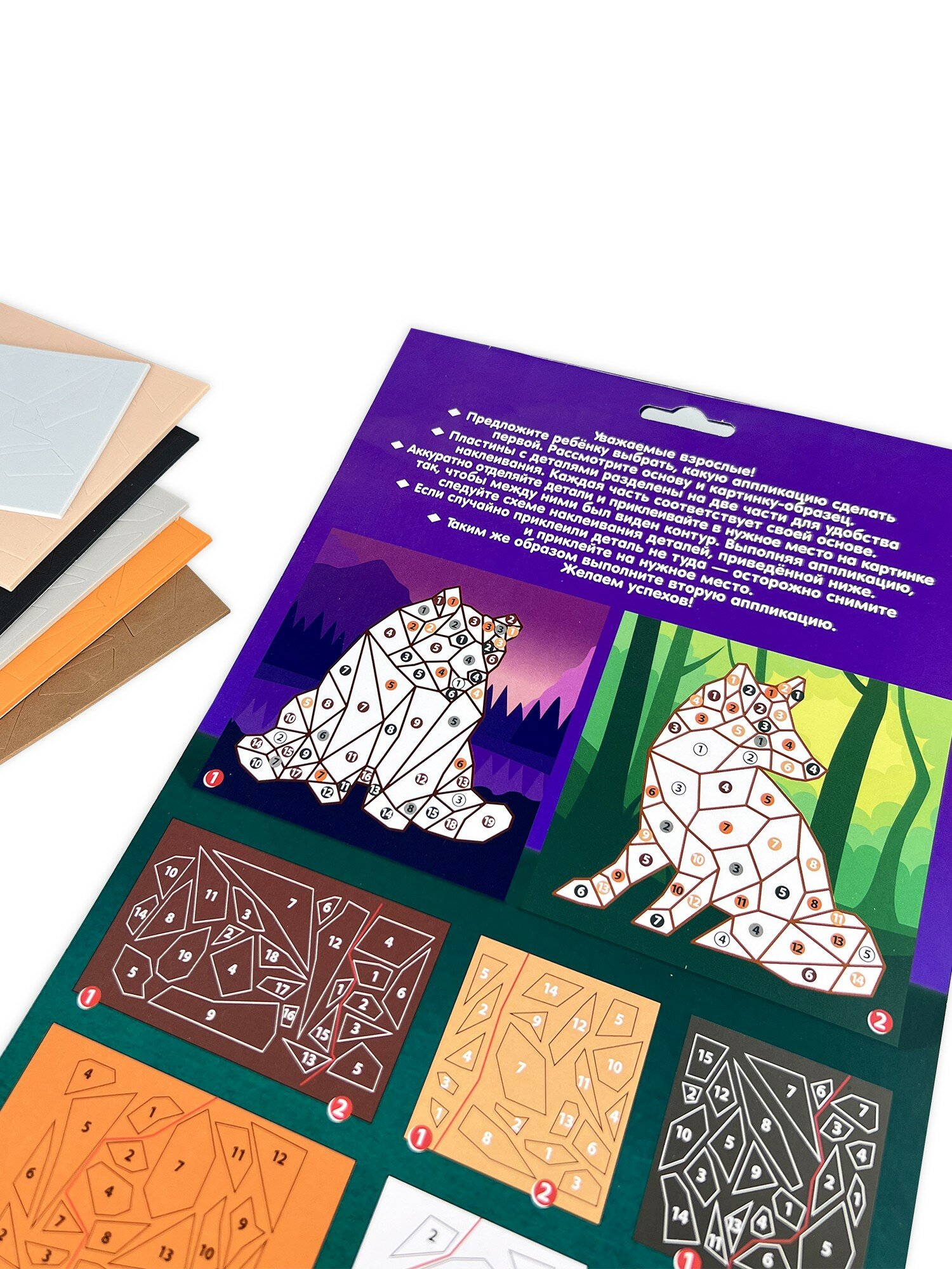 В наборе: 2 цветные основы со схемой размещения деталей, детали из ЭВА на самоклеящейся основе, цветная листовка-образец.