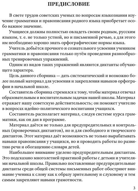 Сборник обучающих диктантов предназначен для учителей начальной школы. Пособие включает в себя разнообразные упражнения тренировочного характера для усвоения и закрепления навыков орфографии. Учебные диктанты расположены в соответствии с курсом грамматики по программе 1, 2, 3 и 4 классов. Пособие содержит предупредительные, творческие, свободные и контрольные (проверочные) диктанты. По опыту многолетней практики наибольшее внимание в сборнике уделено предупредительным диктантам, которые позволяют учащимся воспринимать слово комплексно, как зрительный и слуховой образ. Также в пособие включены словари, при помощи которых учитель дополняет материал, представленный в учебнике. В свете особой важности изучения грамматики и правописания русского языка, отмеченной И.В. Сталиным, составитель стремился к тому, чтобы материал отвечал не только образовательным, но и воспитательным, идейно-политическим задачам школы. Издание пригодится как учителям начальных классов, так и родителям, которые занимаются с детьми дополнительно.