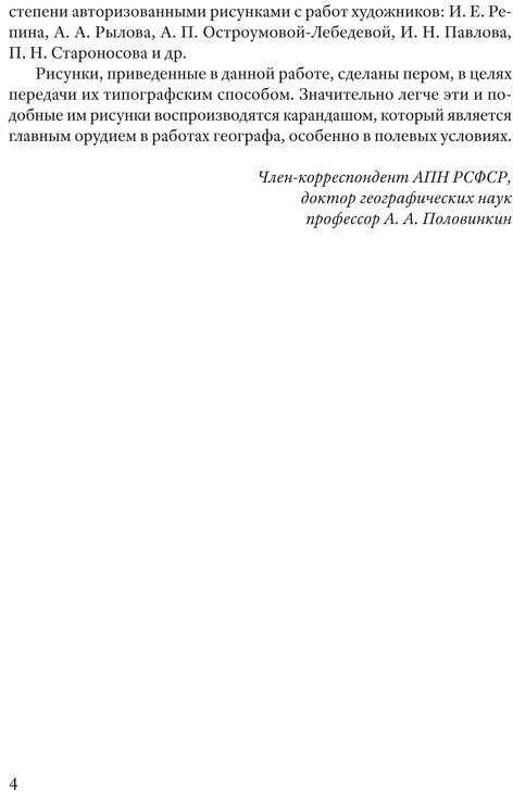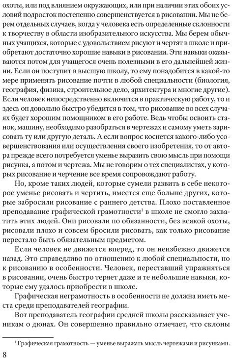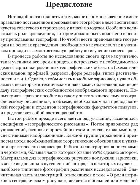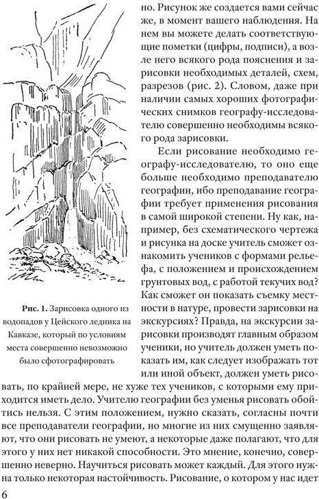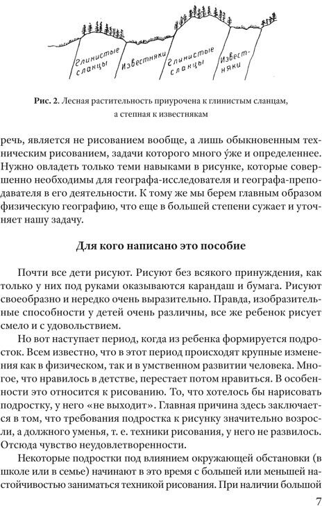 Графическая грамотность (умение выражать мысль чертежами и рисунками) – навык, необходимый человеку на протяжении всей жизни. В биологии, физике, архитектуре, строительстве даже самая качественная фотография никогда не заменит ученым универсальный язык рисунка. На уроках географии ученикам часто приходится делать зарисовки различных объектов (схематических планов, профилей, разрезов, форм рельефа, типов растительности и т.д.). Такая работа требует не художественных, а элементарных технических навыков. Предлагаемая книга не только объясняет всю специфику «географического рисования», но и содержит практические упражнения. Задания расположены по принципу от более простого к более сложному: от схематичных изображений форм рельефа и растительности учащиеся переходят к рисованию объектов с натуры. Книга иллюстрирована рисунками, схемами и чертежами автора, что облегчает подачу и усвоение материала. Пособие по рисованию предназначено для учителей географии и изобразительного искусства, студентов географических и художественных факультетов, а также родителей, занимающихся с детьми самостоятельно.