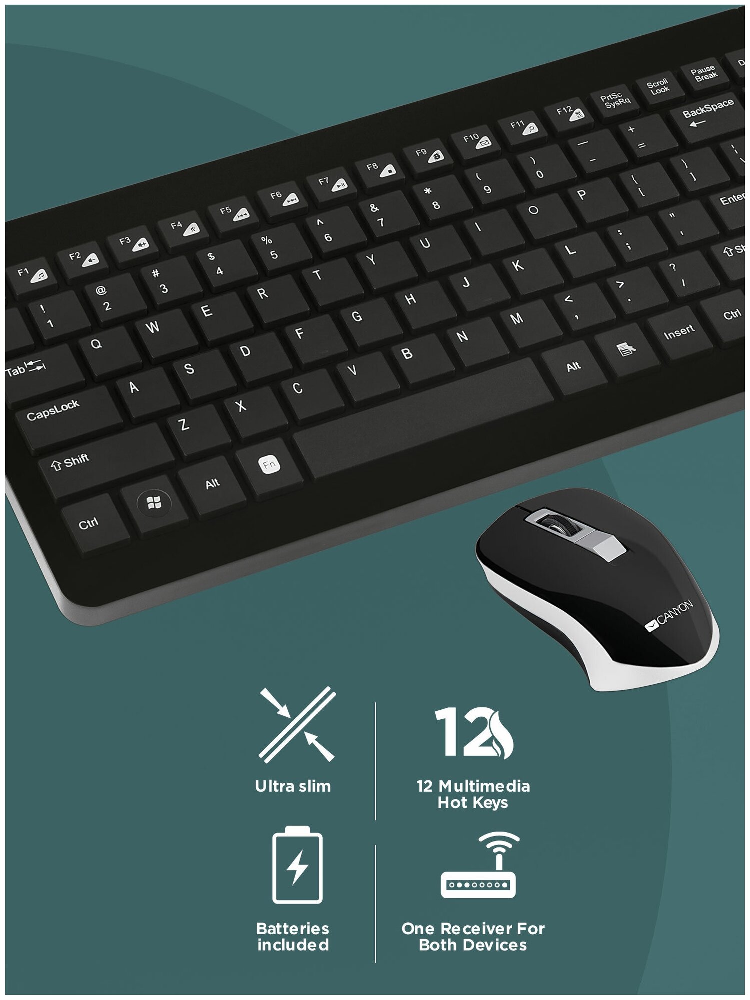 Стильный беспроводной комплект из клавиатуры и мышки Canyon CNS-HSETW3, удобный как для домашнего использования, так и для путешествий. Легко и одновременно подключается к устройству-приемнику. Для удобства пользователей предусмотрены клавиши быстрого доступа к калькулятору, управлению музыкой и другим часто используемым программам.