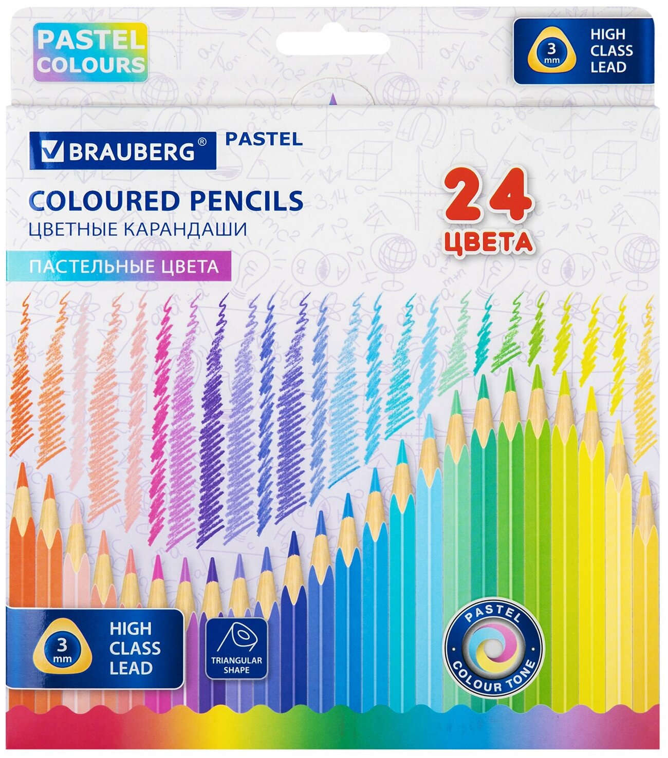 Трехгранные цветные карандаши высокого качества из натурального дерева BRAUBERG серии PASTEL обеспечивают гладкое письмо благодаря мягкому грифелю. Особое качество красящего пигмента гарантирует приятные пастельные цвета. В наборе 24 пастельных цвета: пастельный красный, персиковый, пастельный оранжевый, пастельный жёлтый, пастельный зелёный, мятный, бледно-лазурный, небесно-голубой, пастельный сиреневый, пастельный пурпурный, пастельный фиолетовый, светло-серебристый, бежевый, пастельно-розовый, лавандовый, лавандово-фиолетовый, королевский пурпурный, пастельный голубой, бледно-васильковый, пастельный бирюзовый, оливковый, грушевый, соломенный, бледно-золотой. Трехгранная форма корпуса позволяет карандашу не скатываться с поверхности стола во время занятий рисованием. Карандаши изготовлены из древесины ценных пород и имеют лакированный корпус. Высокосортная древесина и качество исполнения гарантируют легкую заточку. Грифель диаметром 3 мм обладает повышенной прочностью. Все карандаши заточены и поставляются в картонной упаковке с европодвесом. Рисование цветными карандашами способствует развитию творческого мышления, мелкой моторики рук, цветового восприятия, фантазии и воображения ребенка. Вдохновитесь и окунитесь в мир творчества с цветными карандашами BRAUBERG PASTEL! Они идеально подойдут как для начинающих, так и для опытных художников.