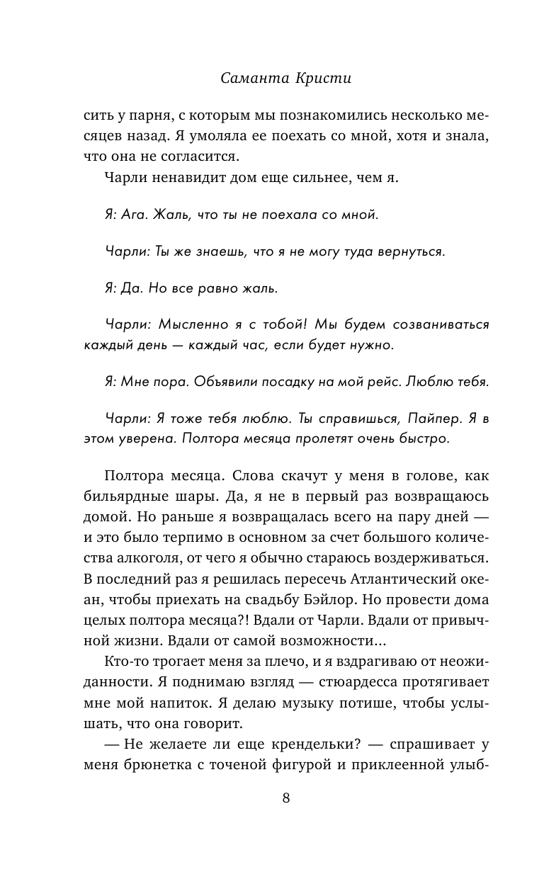 Пайпер Митчелл приходится вернуться в родной Нью-Йорк на свадьбу старшей сестры. Она надеялась, что эта поездка будет быстрой, но ей приходится задержаться. На каждом углу Пайпер встречает тени прошлого. Они преследуют ее и пробуждают болезненные воспоминания о событиях, которые сломали ее жизнь шесть лет назад. Девушка хочет скорее сбежать из города, но все планы сразу же рушатся из-за парня, которого она встречает в аэропорту. Звезда футбола. Очаровательный отец-одиночка. Кажется, Пайпер придется нарушить свое единственное правило – больше никогда никого не любить.