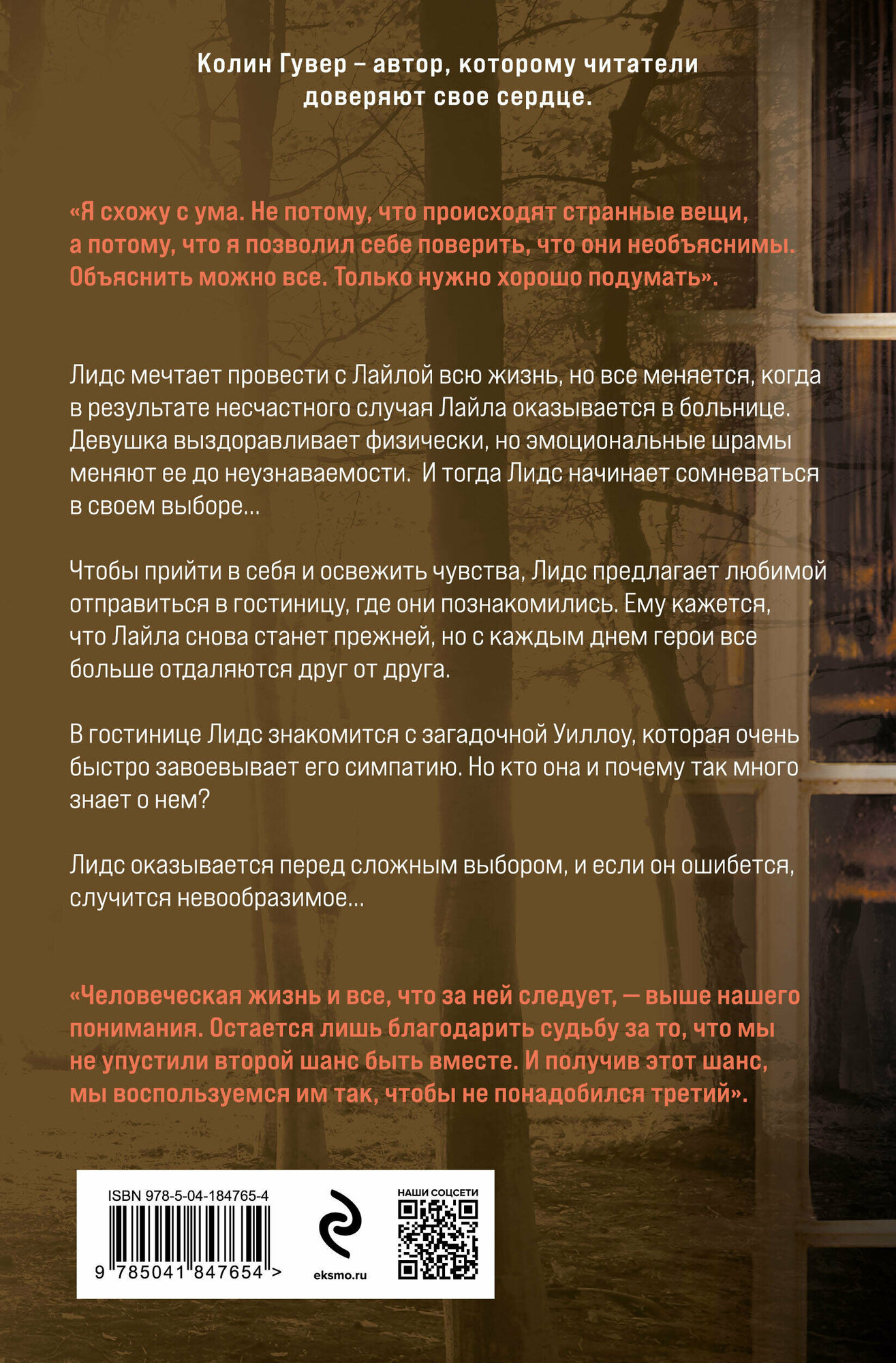 Отличный психологический триллер с мистическим сюжетом. Необычная пронзительная история любви Лидса и Лаймы , в которую смешался несчастный случай , перевернувший всё с ног на голову. Сюжет оказался неожиданно динамичным , что поначалу трудно было предположить. Автору удалось поддерживать напряжённую интригу до самого финала. Замечательная книга о сильных чувствах.