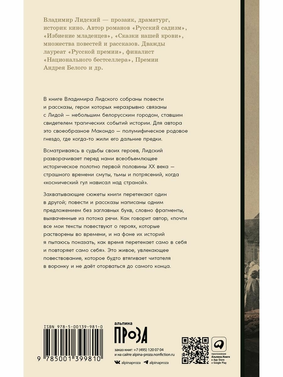 В книге Владимира Лидского собраны повести и рассказы, герои которых неразрывно связаны с Лидой — небольшим белорусским городом, ставшим свидетелем трагических событий истории. Для автора это своеобразное Макондо — полумифическое родовое гнездо, где когда-то жили его дальние предки.