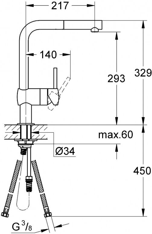 Однорычажный смеситель для мойки, поворотный выдвижной излив с возвратной пружиной, керамический картридж GROHE SilkMove® ?46 мм, расход воды 11 л/мин с возможностью регулировки, подключение - гибкая подводка 3/8"х450 мм.