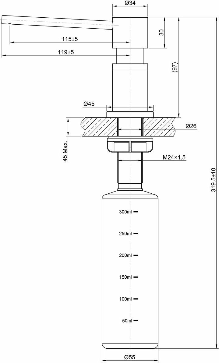 Дозатор врезной. Увеличенная высота над столешницей - 97 мм. Материал дозатора: нержавеющая сталь марки SUS 304 с PVD nano-покрытием. мкость для жидкого моющего средства из полиэтилена HDPE - 0,3 л. Свойства покрытия: устойчивость к загрязнениям и отпечаткам пальцев. Цвет-графит