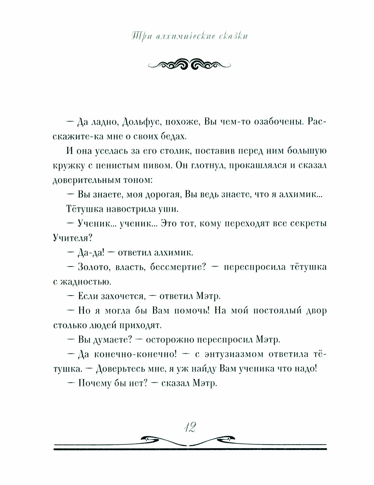 Алхимия — это не только работа с веществами, с тем чтобы получить «тонкое из толстого». Алхимия, по словам самого автора, — это искусство быть счастливым. А почему так счастливы мы бываем в детстве? Патрик Бюренштейнас — настоящий алхимик XXI века. Он сложил три волшебные сказки и в фольклорной форме говорит с нами не на «птичьем», непонятном, языке, а обращается к ребёнку внутри нас. Открытость миру и легендам, умение мечтать и увлекаться — это составная часть Искусства. Великое Искусство требовательно к тому, кто собирается к нему приступить, а поэтому начальный этап состоит из очищения: как металла, так и будущего Посвящённого.