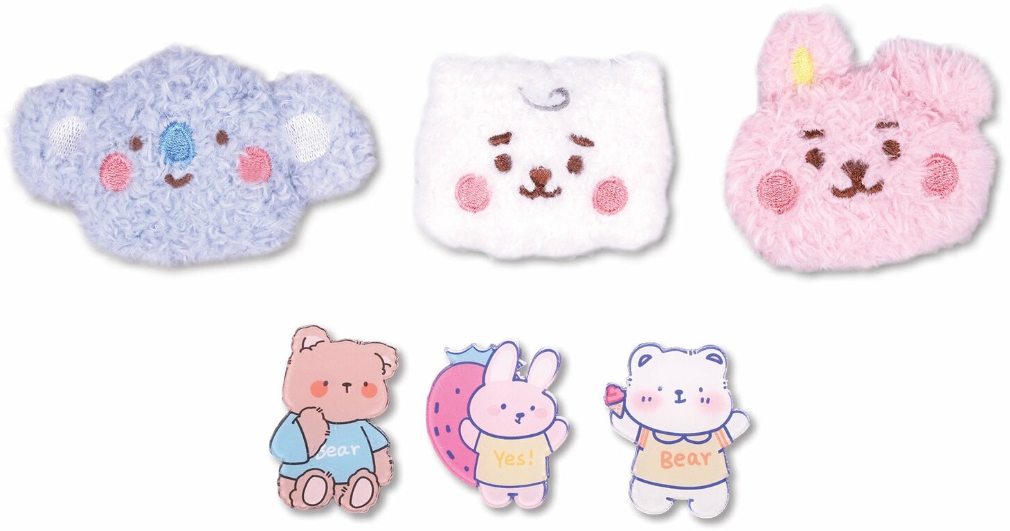 К каждому набору прилагается 6 значков для декорирования: 3 мягких плюшевых значка в виде забавных мордочек животных и 3 пластиковых значка с милыми зверятами.