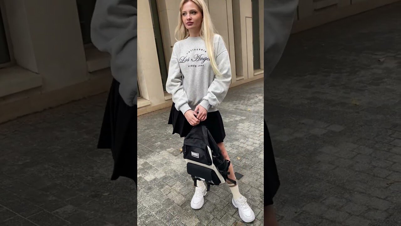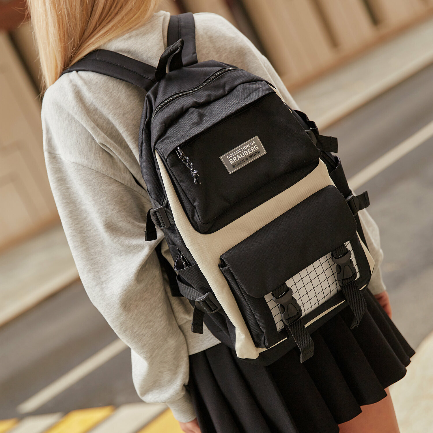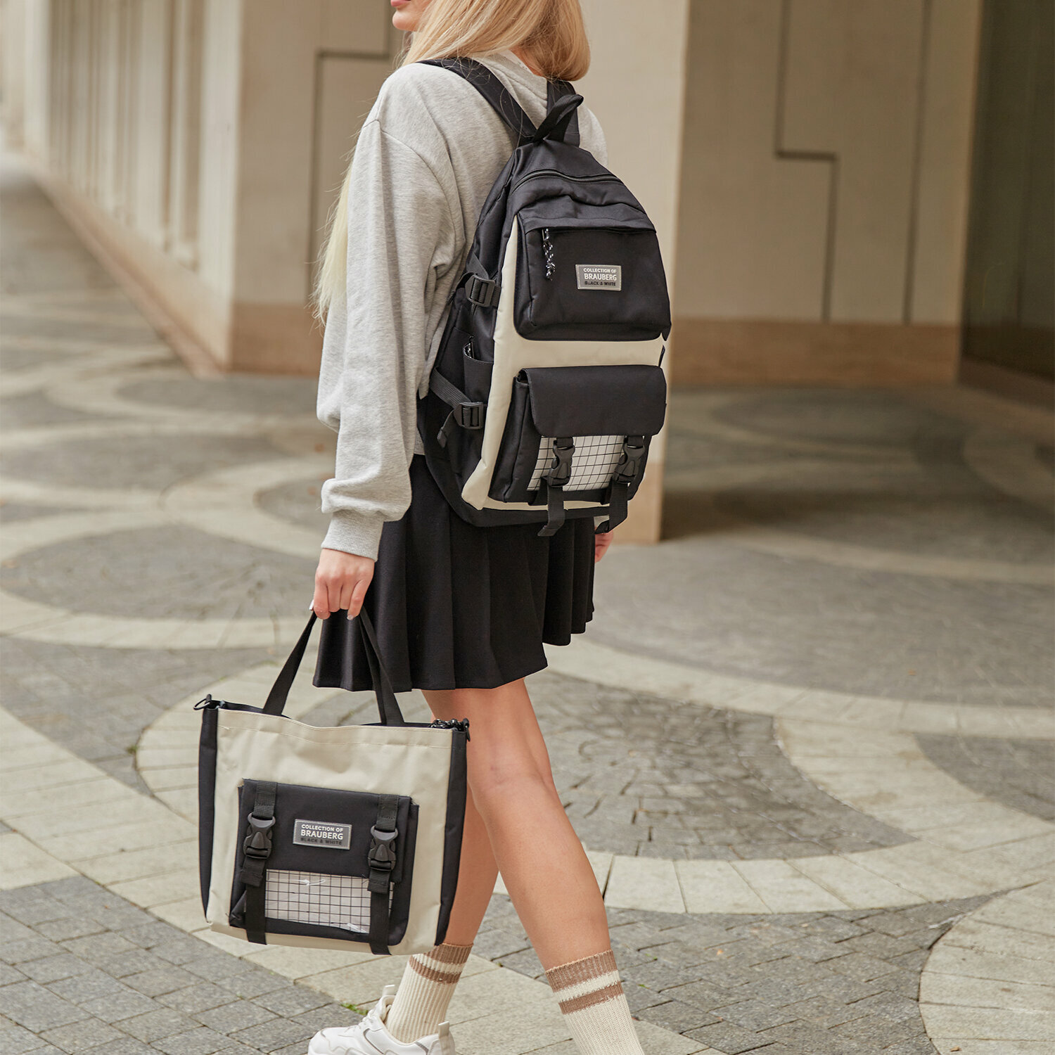 Рюкзак и шоппер выполнены в светло-бежевом и черном цвете. Накладные карманы — это не только удобные элементы, но и популярное дизайнерское решение. Прозрачный передний карман можно декорировать с помощью значков или других предметов.