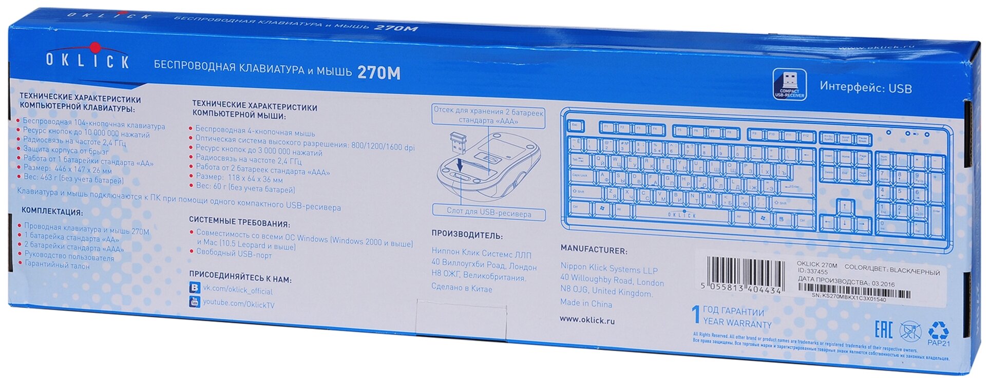 | Комплектация | Беспроводная клавиатура и мышь 270M, батарейки AAA - 2 и AA -1, USB ресивер |