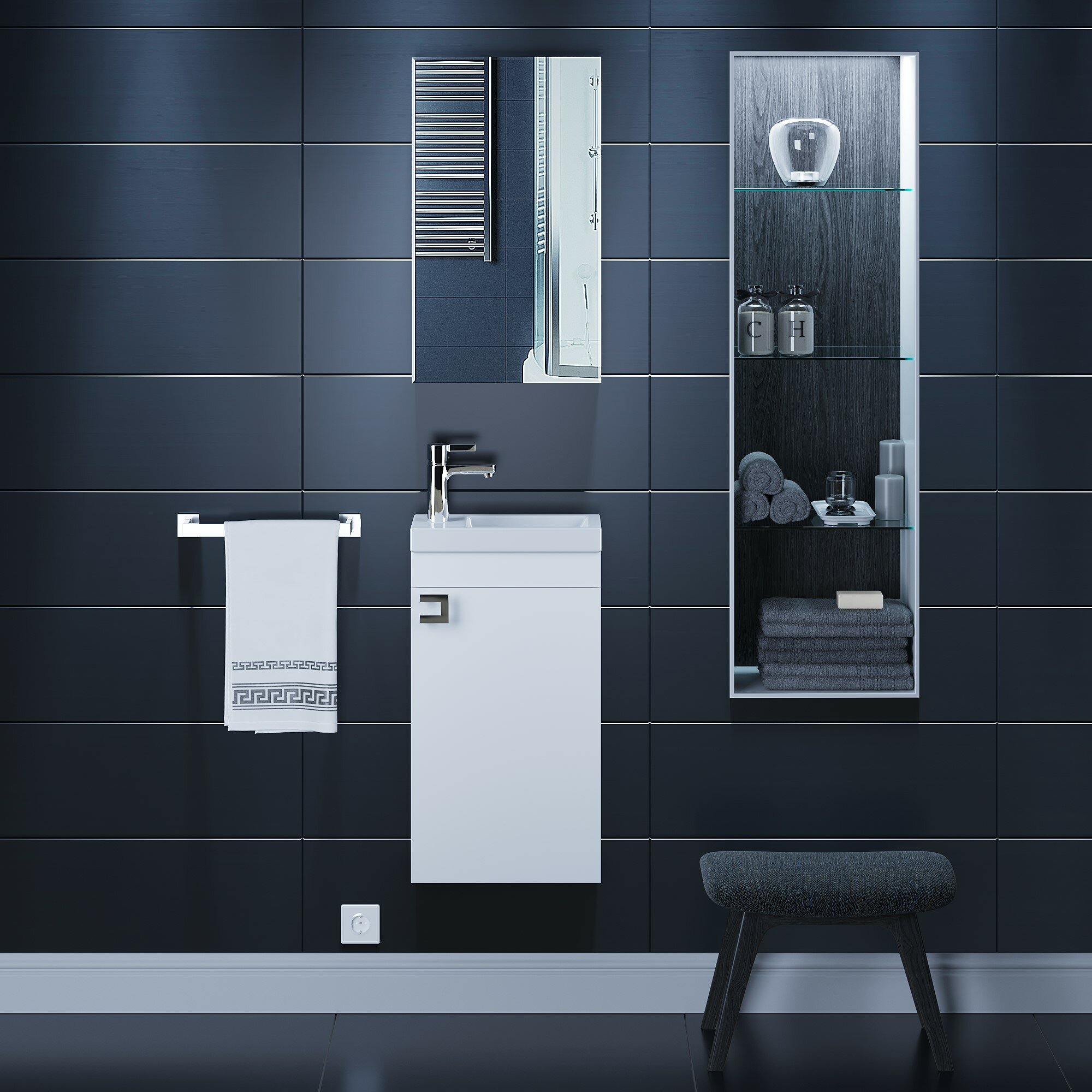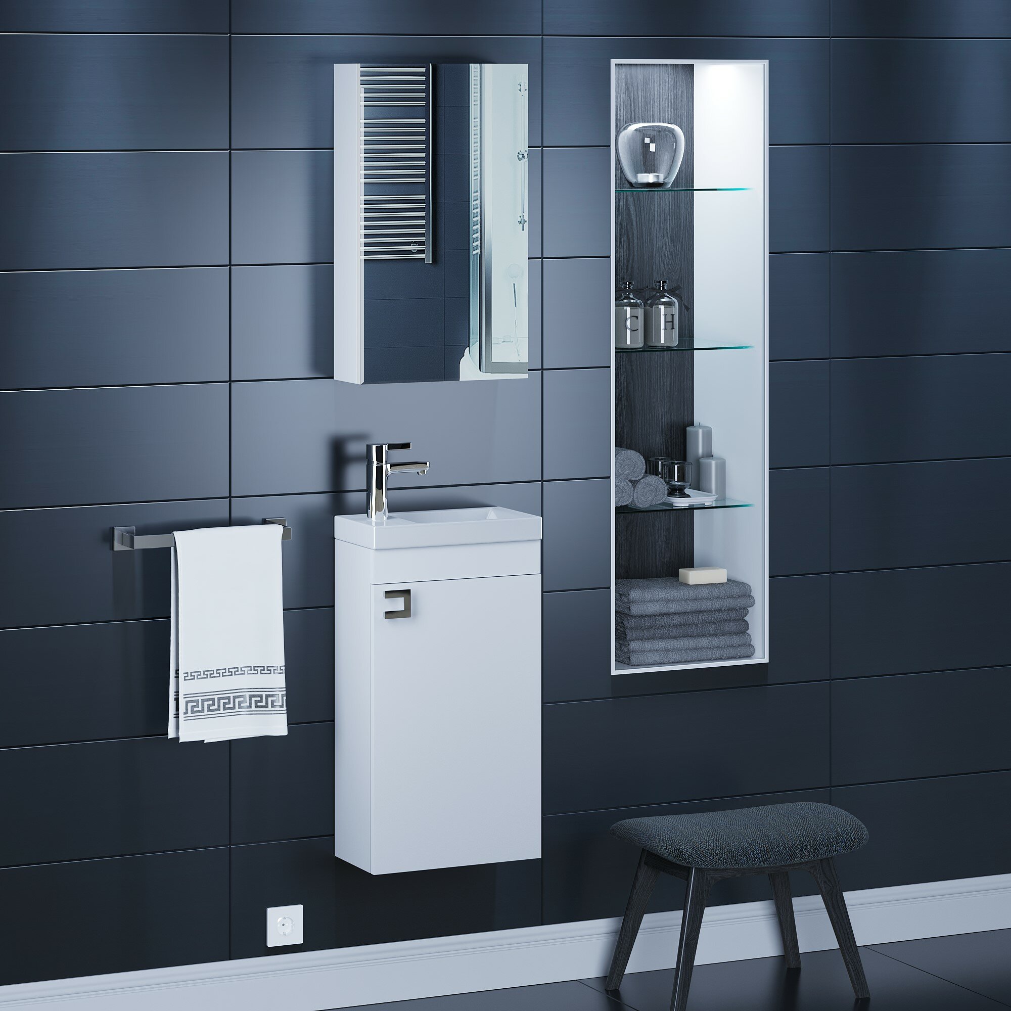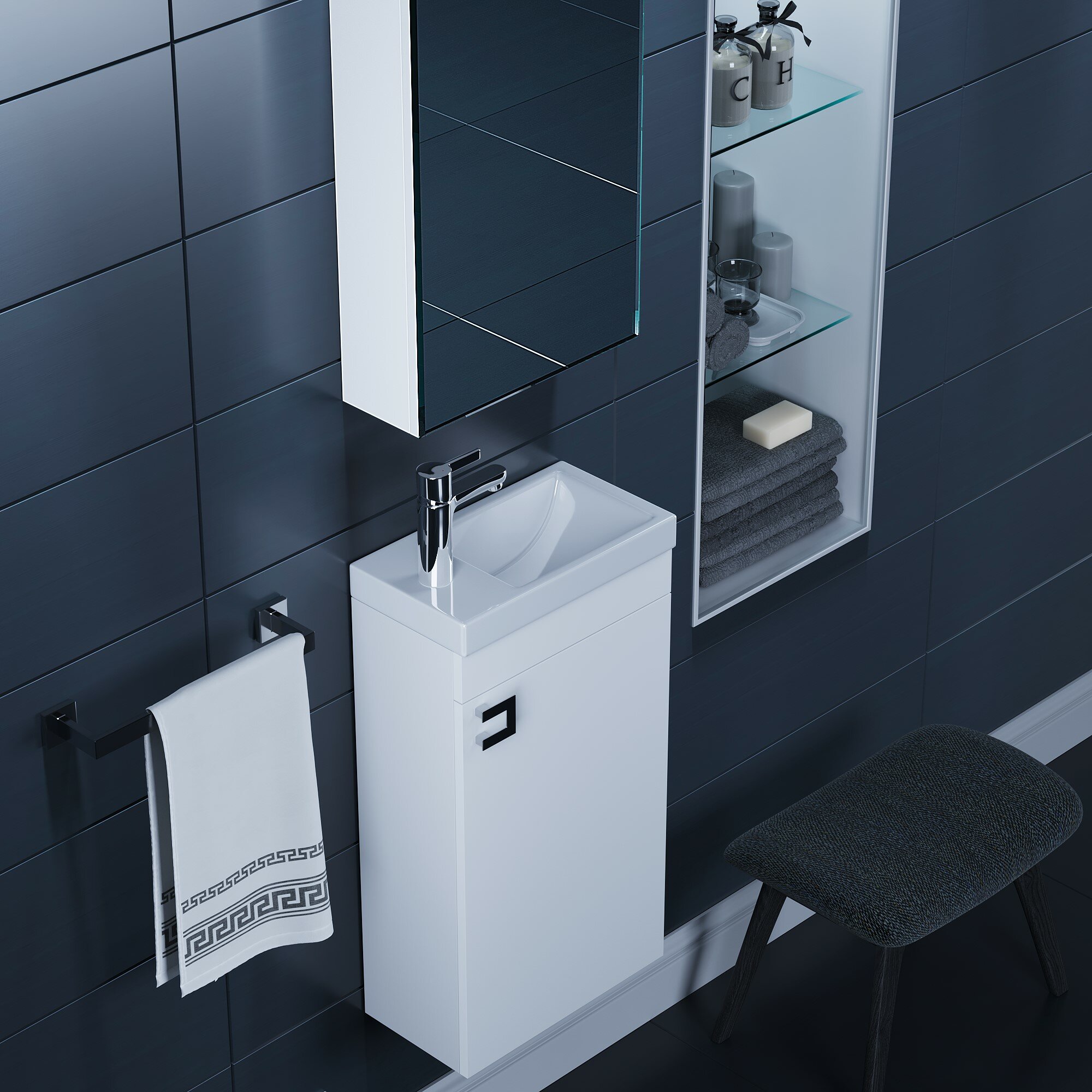Компактные размеры и лаконичный дизайн позволяют легко встроить тумбу под раковину Uperwood Vizo 40 см в интерьер даже самой малогабаритной ванной комнаты. Корпус тумбы под раковину Uperwood Vizo изготовлен из влагостойкого ЛДСП, МДФ и облицован глянцевой пленкой ПВХ. Материал фасада тумбы - МДФ в белой глянцевой пленке ПВХ. Система хранения тумбы представлена одной полочкой из влагостойкой ЛДСП и находится за распашной дверцей. Для установки на тумбу подходит раковина из литьевого мрамора Andrea Vizo 40 см, прямоугольная, с отверстием для установки смесителя (арт. 4650002680906) Комплект из тумбы с раковиной Vizo можно дополнить зеркалом Uperwood Vizo шириной 40 см: Зеркало для ванной Uperwood Vizo 40*70 см, черный профиль (арт. 291020236) Зеркало для ванной Uperwood Vizo 40*70 см, белый профиль (арт. 291020235)