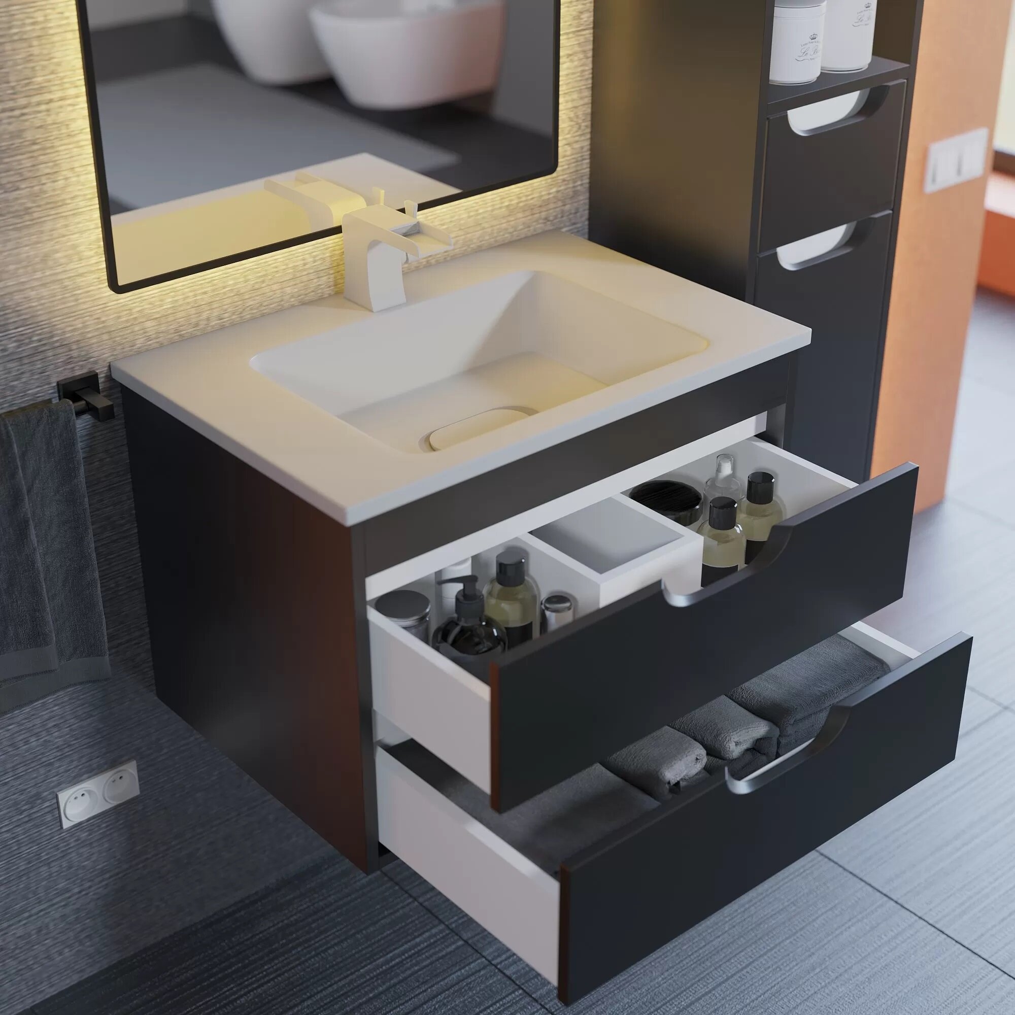 Подвесная тумба под раковину для ванной из коллекции Uperwood Modul представляет собой функциональное, надежное и практичное решение, которое отлично впишется в любой современный дизайн ванной комнаты.Элегантный минималистичный дизайн тумбы в белом, белом с графитовыми вставками и черном цвете дополняет ее безупречная матовая поверхность. Белая тумба также представлена в глянцевом исполнении. Подвесной монтаж изделия обеспечит легкость в уборке помещения, и визуально даст больше пространства Вашей ванной комнате.Фасад и боковые стенки изделия, выполненные из МДФ, покрыты эмалью Hesse (производство Германия). Толщина МДФ 16 мм.Ящики изготовлены из ЛДСП и оснащены доводчиками. Вся фурнитура и доводчики премиального качества.Размерный ряд тумб под раковину Uperwood Modul представлен моделями 50 и 60 см с одной дверцей или одной дверцей и открытыми полками. Тумбы под раковину размерами 65-100 см представлены в моделями с двумя выдвижными ящиками.Исполнение тумб: белый глянец, белый матовый, белый матовый с графитовыми вставками и черными ящиками, черный матовый с белыми ящиками внутри.Тумба поставляется в собранном виде, в комплект входит крепеж для подвесного монтажа. К тумбам Uperwood Modul подходят полувстраиваемые раковины из коллекции Uperwood Modul, выполненные из литьевого мрамора. Раковина подбирается строго под размер тумбы. Дополните комплект для ванной Uperwood Modul подвесным шкафом-пеналом в цвет тумбы, а также зеркалом с подсветкой Uperwood Modul, подходящего размера.