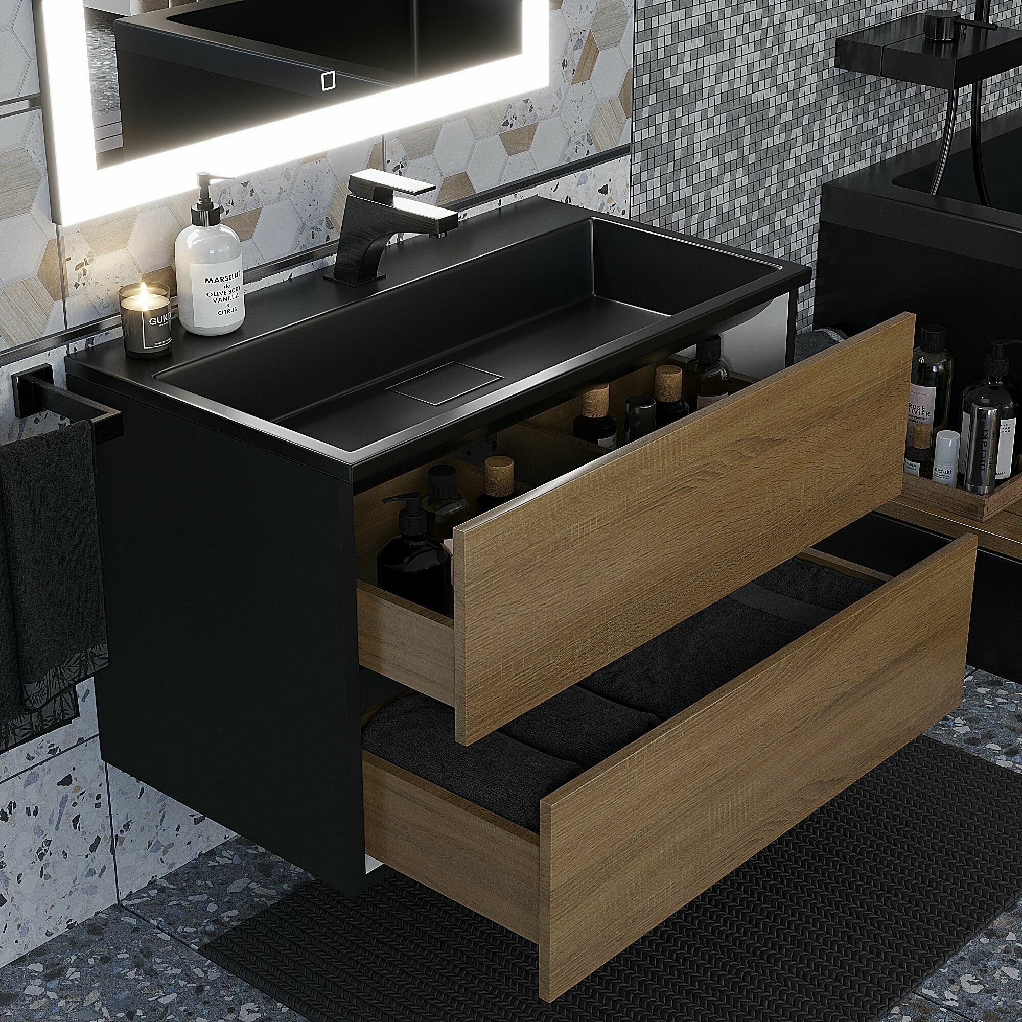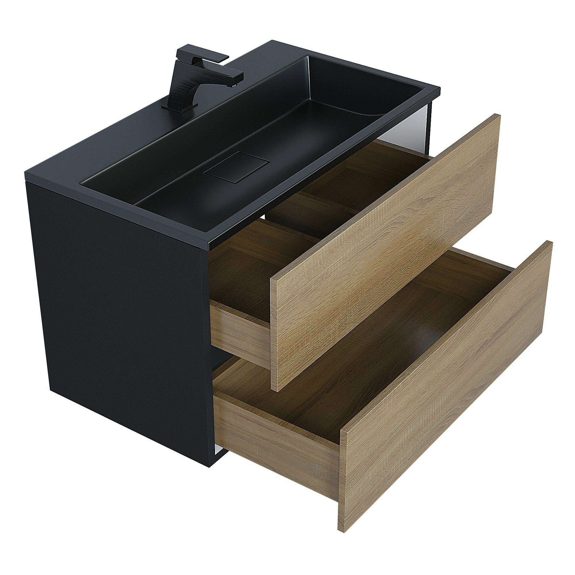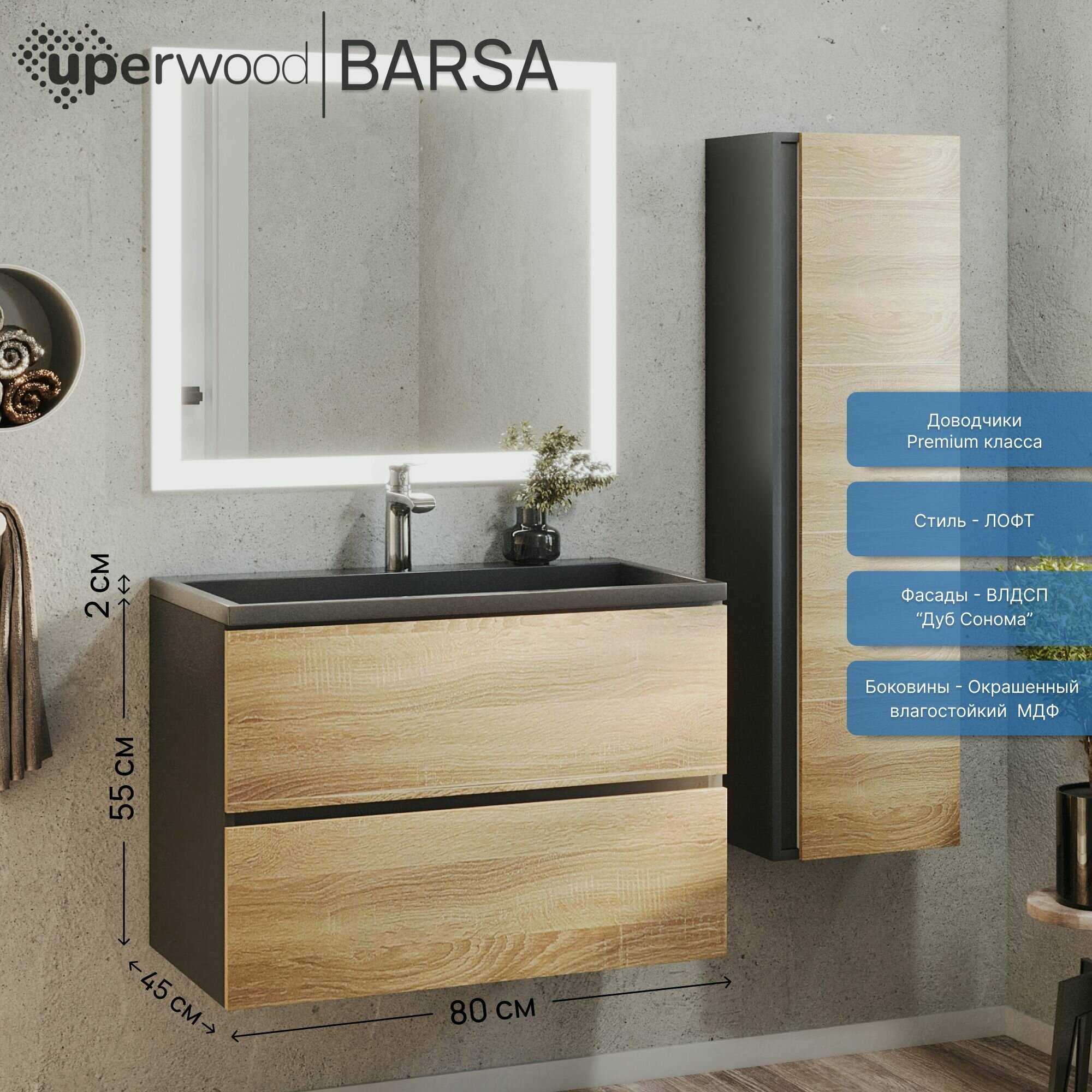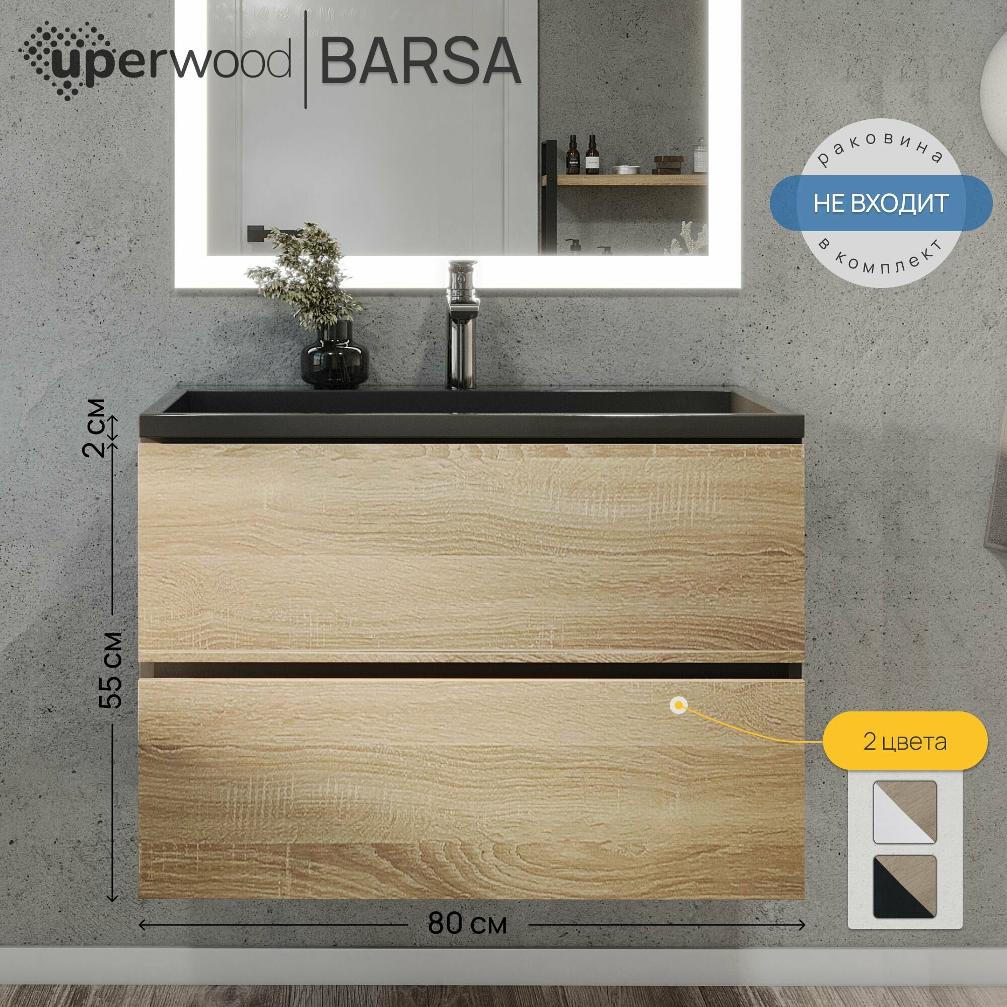 Подвесная тумба под раковину для ванной комнаты из коллекции Uperwood Barsa с двумя выдвижными ящиками представляет собой функциональное, надежное и практичное решение, которое отлично впишется в любой современный интерьер ванной комнаты.Подвесной монтаж изделия обеспечит легкость в уборке помещения и визуально даст больше пространства Вашей ванной комнате.Боковые стенки изделия, выполненные из МДФ, покрыты эмалью Hesse (производство Германия) черного и белого цвета. Толщина МДФ 16 мм.Фасад - ЛДСП в пленке под дерево, цвет дуб сонома. Выдвижные ящики изготовлены из влагостойкой ЛДСП.Ящики оснащены доводчиками. Вся фурнитура и доводчики премиум-класса.Размерный ряд тумб под раковину для ванной Uperwood Barsa представлен моделями от 50 до 100 см.Для тумб Uperwood Barsa подходят раковины Uperwood Barsa соответствующих размеров черного или белого цвета на выбор покупателя.Тумба поставляется в собранном виде, в комплект входит крепеж для подвесного монтажа. Дополните Ваш комплект из тумбы и раковины Uperwood Barsa подвесным шкафом-пеналом из коллекции Barsa белого (арт. 293020529) или черного цвета (арт. 293020545). Также можно собрать полноценный комплект, добавив зеркало с led-подсветкой из коллекции Uperwood Barsa.
