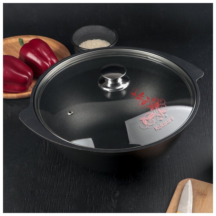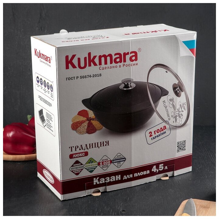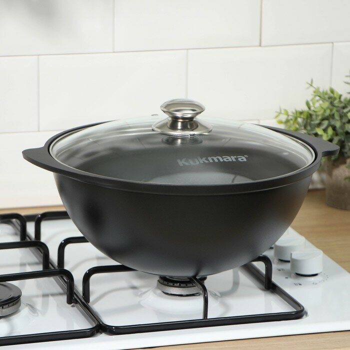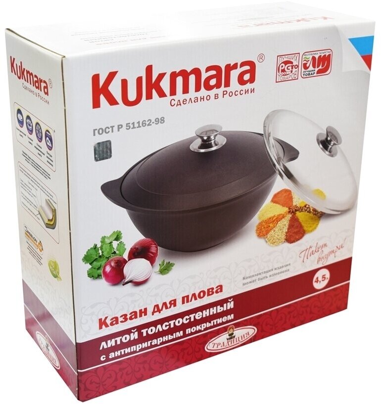 Казан с крышкой "Kukmara" изготовлен из литого алюминия и покрыт антипригарным покрытием Greblon Non-Stick C2+, усиленным керамическими частицами. Казан "Kukmara" - подходящая посуда для самых разнообразных блюд. С его помощью вы получите превосходный результат при жарке мяса или курицы, тушении овощей, приготовления плова.