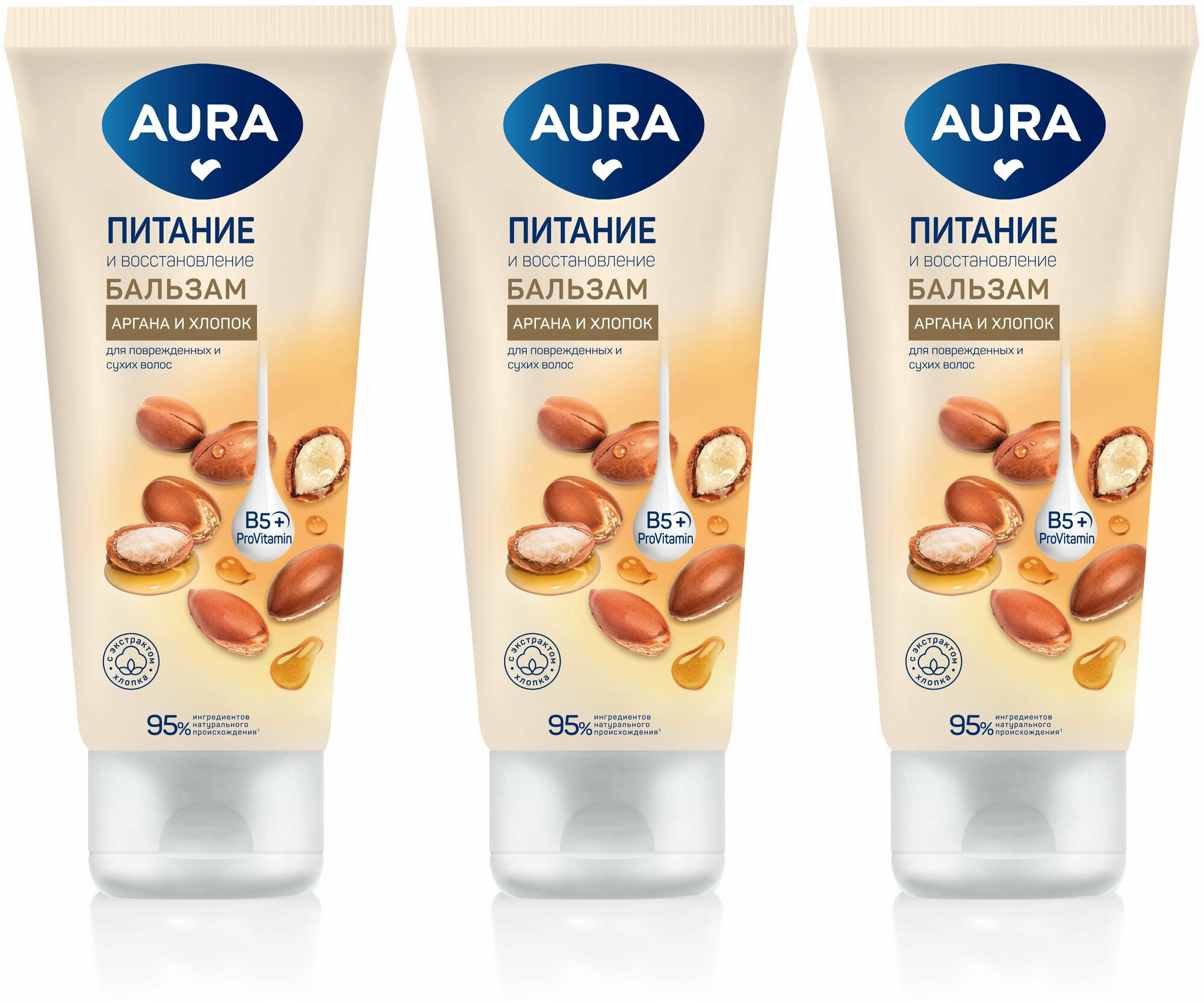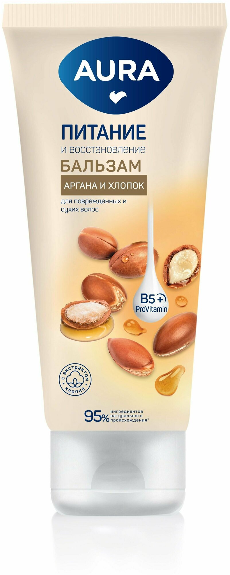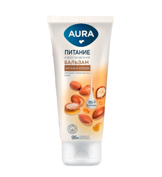 Бальзам AURAПитание и восстановление предназначен для ухода за поврежденными и ослабленными волосами, нуждающихся в интенсивном уходе. Выравнивает структуру волос, делает их блестящими и шелковистыми, облегчает расчесывание. Глубоко проникает в структуру волос, питает и восстанавливает их по всей длине без утяжеления. МАСЛО АРГАНЫ увлажняет, смягчает и питает каждый волосок, предупреждает появление секущихся кончиков. ПРОВИТАМИН В5 восстанавливает поврежденную структуру волос, глубоко питает и разглаживает их. ХЛОПКОВОЕ МОЛОЧКО легко проникает в структуру волос, нежно ухаживает за ними и придает особую мягкость и блеск. Бальзам на 95% состоит из ингредиентов натурального происхождения. Благодаря АКТИВНОЙ ФОРМУЛЕ ТРОЙНОГО УХОДА волосы восстанавливаются и приобретают здоровый внешний вид при его регулярном использовании. Для наилучшего эффекта рекомендуем использовать вместе с шампунем AURA Питание и восстановление.