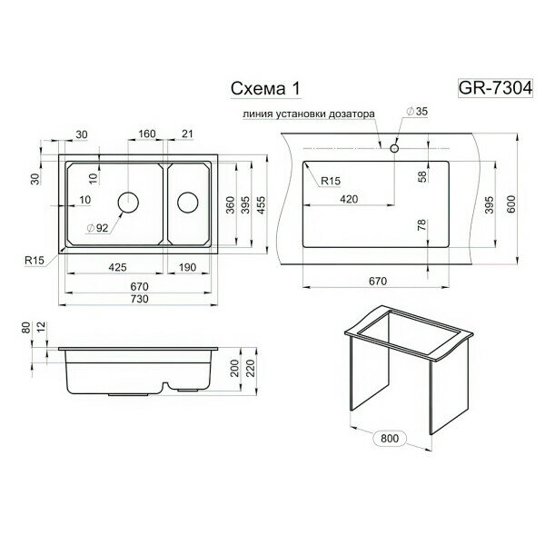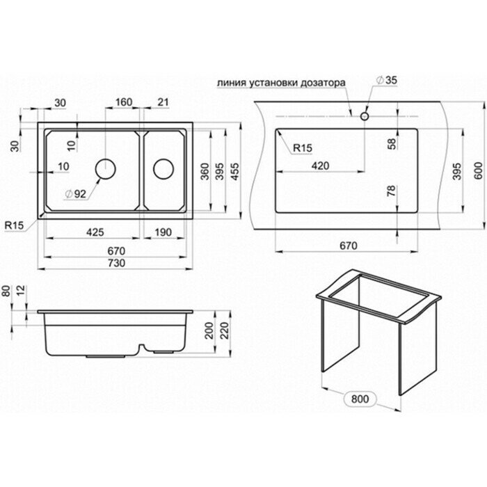 Размеры чаши составляют 675х380 мм при глубине 220 мм. Это позволяет мыть крупную посуду без риска ее повреждения.