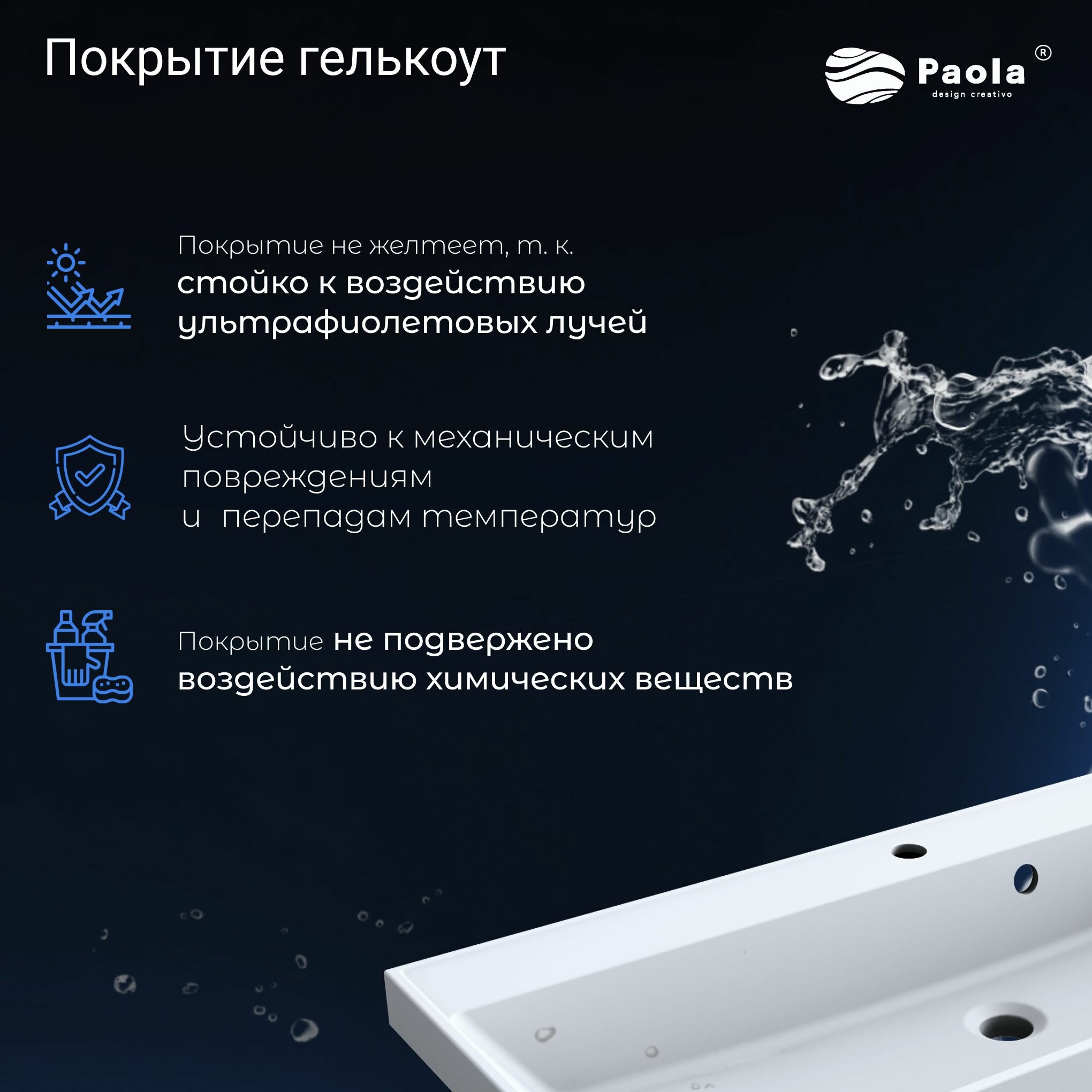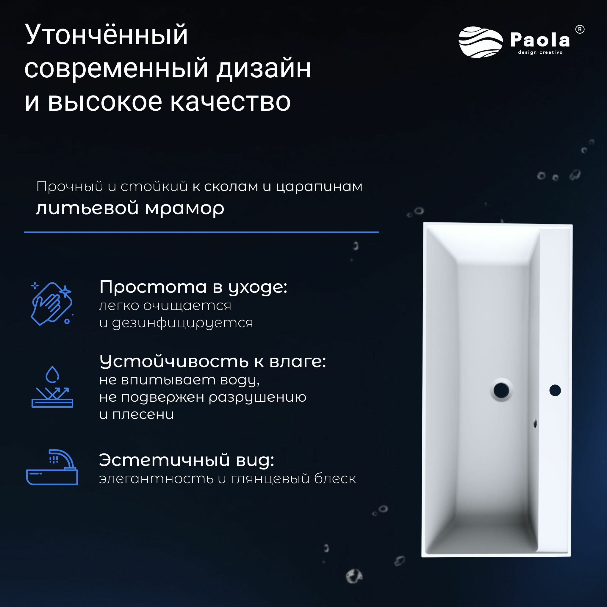 Раковина Paola Alba 1000 c возможностью установки как на столешницу, так и на тумбу. Современная, стильная, эргономичная. Paola Alba 1000 выполнена из прочного износостойкого литьевого мрамора, сверзху покрыта специальным защитным покрытием гелькоутом. Изделие обладает глянцевым блеском, очень приятное на ощупь, прочное. Даже при минимальном уходе сохраняет безупречный цвет и внешний вид. В комплекте - слив-перелив, технический паспорт и гарантийный талон