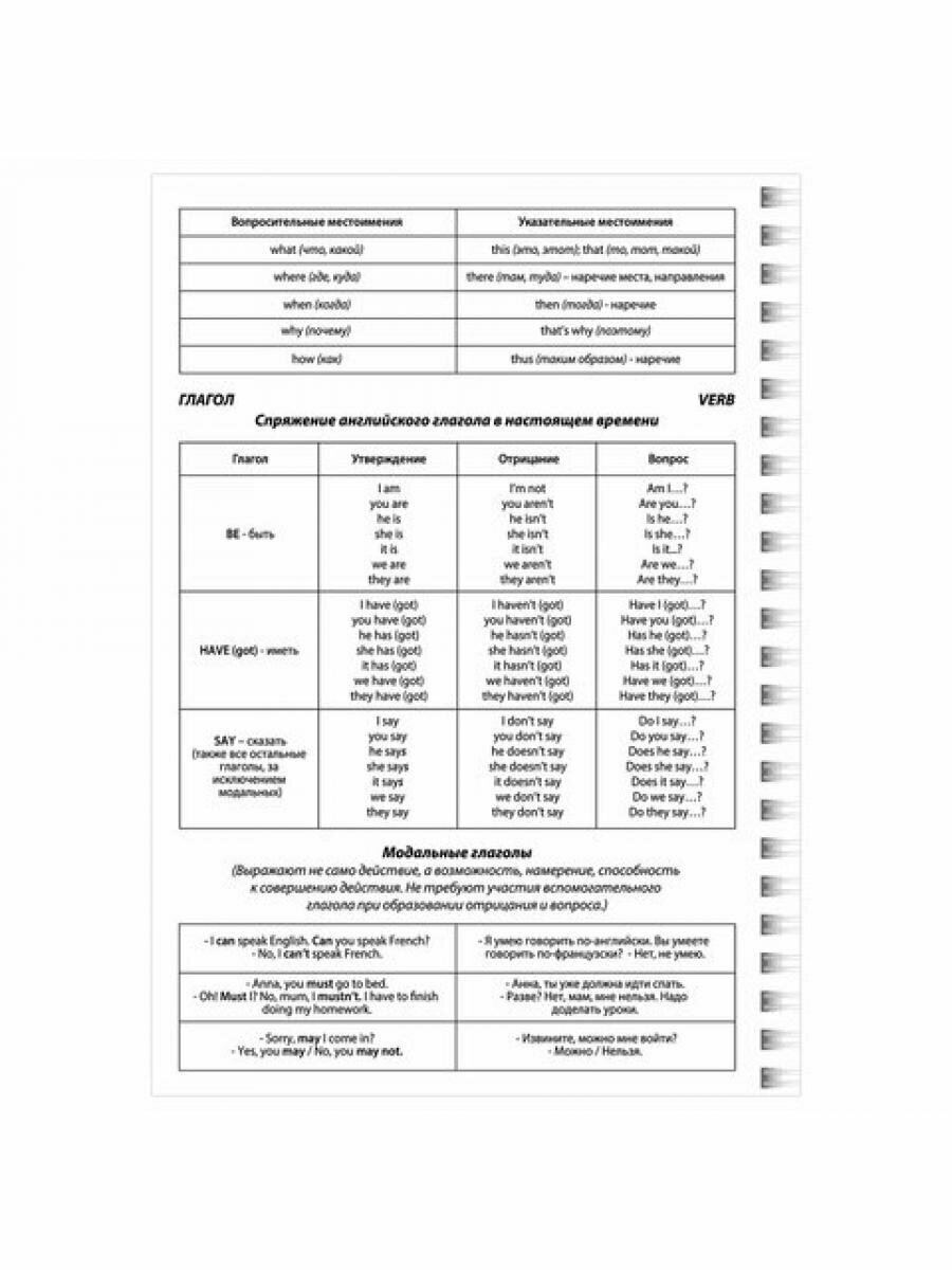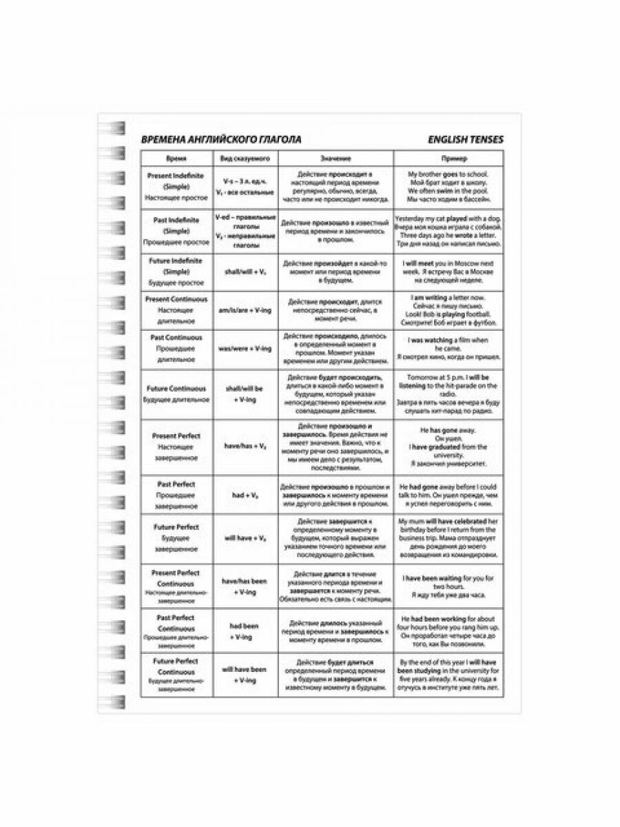 Тетрадь содержит 48 листов формата А5 (144х204 мм). Изготовлена из высококачественной офсетной бумаги плотностью 60 г/м2 и белизной 100%. Листы соединены евроспиралью. Специальная линовка блока. Обложка выполнена из мелованного картона плотностью 190 г/м2. В справочном материале собраны базовые данные по английскому языку — алфавит, времена, глаголы и пр.