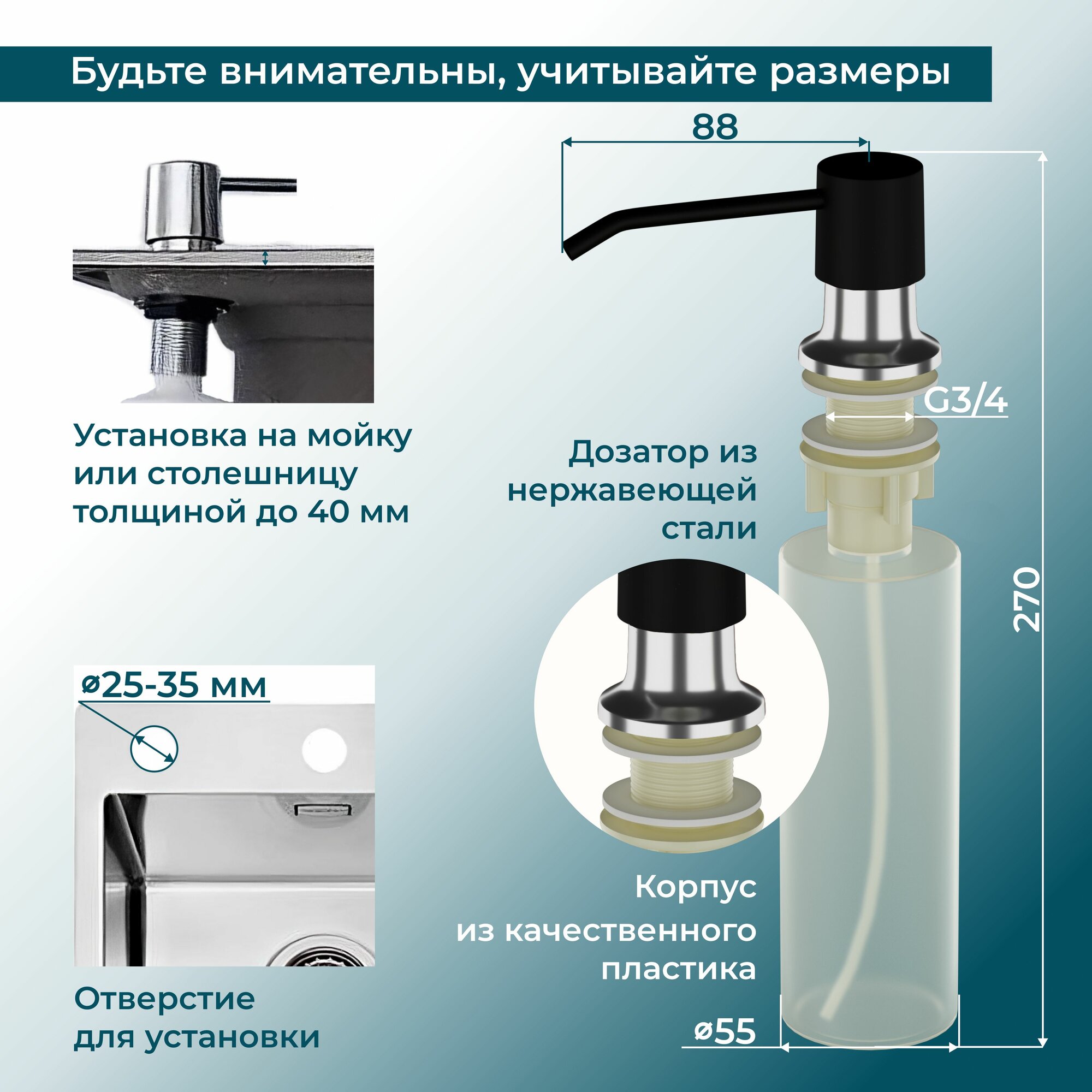 Дозатор предназначен для установки на кухонную мойку из искусственного камня ULGRAN или столешницу толщиной не более 40 мм. Дозатор ULGRAN позволяет с помощью лёгкого нажатия получать необходимое количество жидкости для мытья посуды, при этом важно, что дозатор заполняется моющим средством сверху.Пространство столешницы вокруг мойки освобождается от бутылочек с моющим средством, делая кухню удобной и красивой. Окрашивание дозаторов в фирменные 8 цветов ULGRAN производится на собственных производственных мощностях, соответственно, гарантируется практически точное попадание в цвет моек и смесителей ULGRAN.