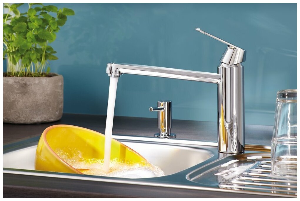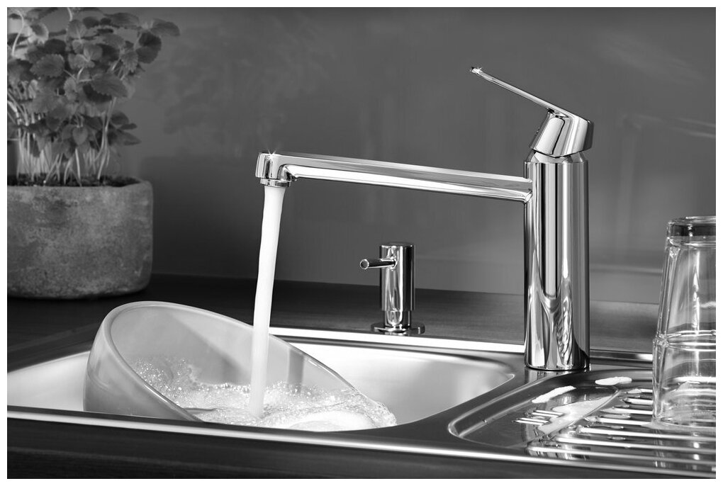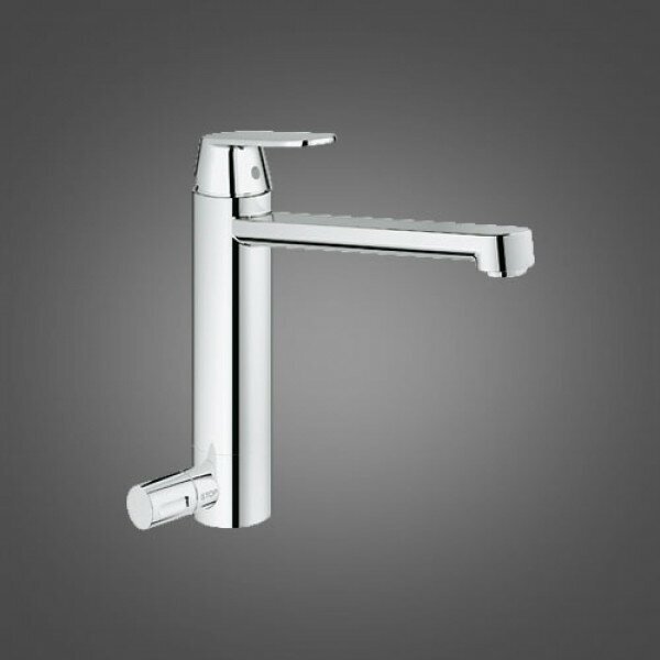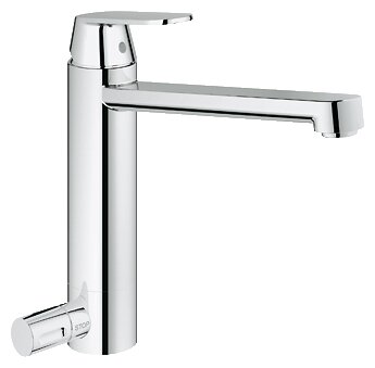 Смеситель для кухни Grohe Eurosmart Cosmopolitan , как и другие модели серии Eurosmart Cosmopolitan, выполнен в строгом и практичном дизайне. Рычажок управления закреплен на керамическом картридже по технологии SilkMove, которая обеспечивает плавное вращение стика и точную настройку температуры воды. Последняя подается равномерно благодаря аэратору Grohe – он установлен на излив с углом поворота 140 градусов.