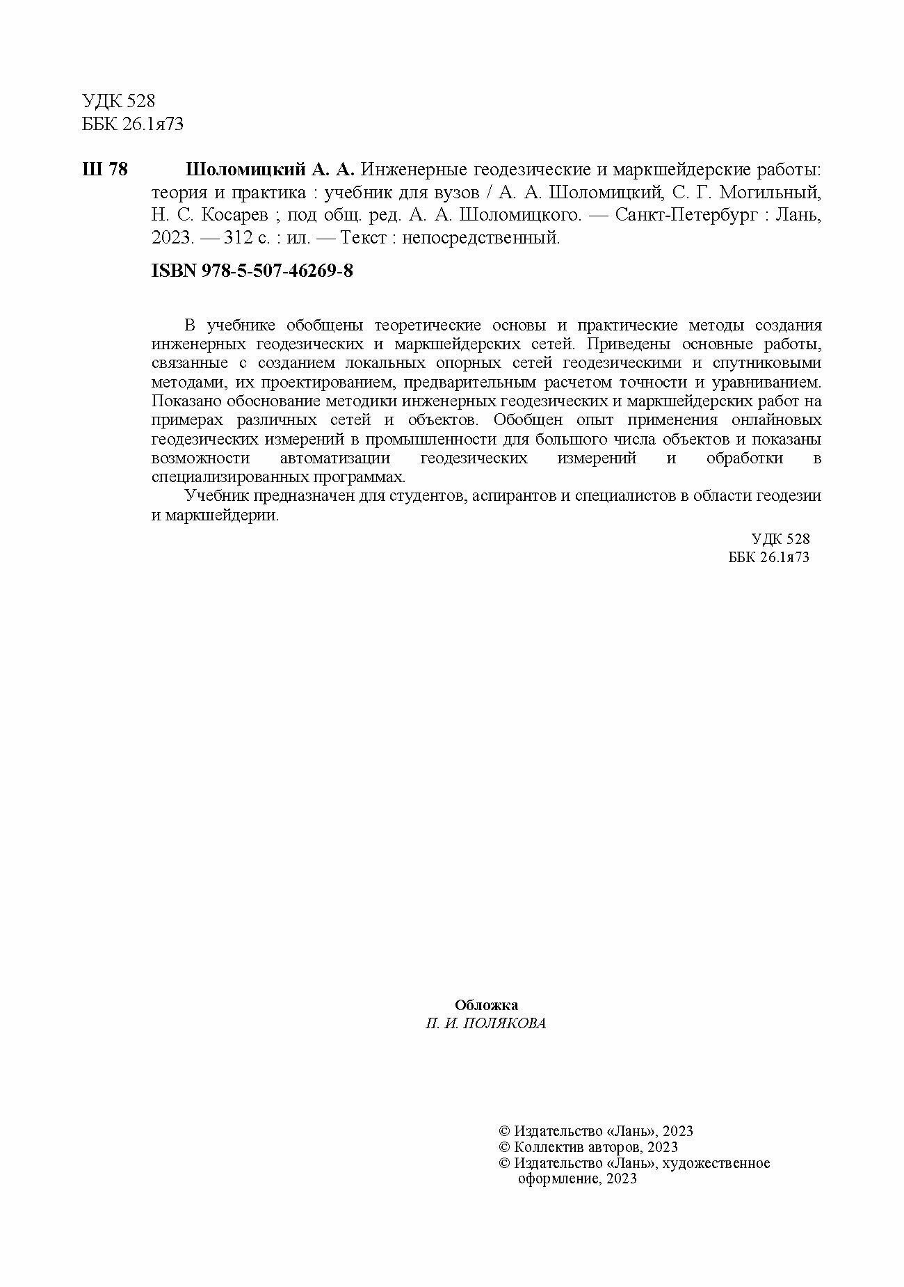 Инженерные геодезические и маркшейдерские работы. Теория и практика (Шоломицкий Андрей Аркадьевич, Могильный Сергей Георгиевич, Косарев Николай Сергеевич); Лань, 2023