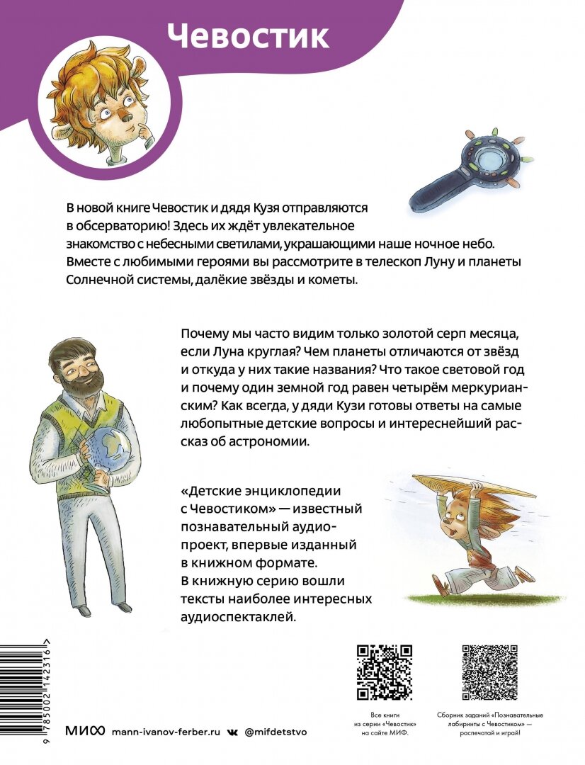 В новой и долгожданной книге Чевостик и дядя Кузя отправляются в обсерваторию! Здесь их ждет увлекательное знакомство с небесными светилами, украшающими наше ночное небо. Вместе с любимыми героями вы рассмотрите в телескоп Луну и планеты Солнечной системы, далекие звезды и кометы.