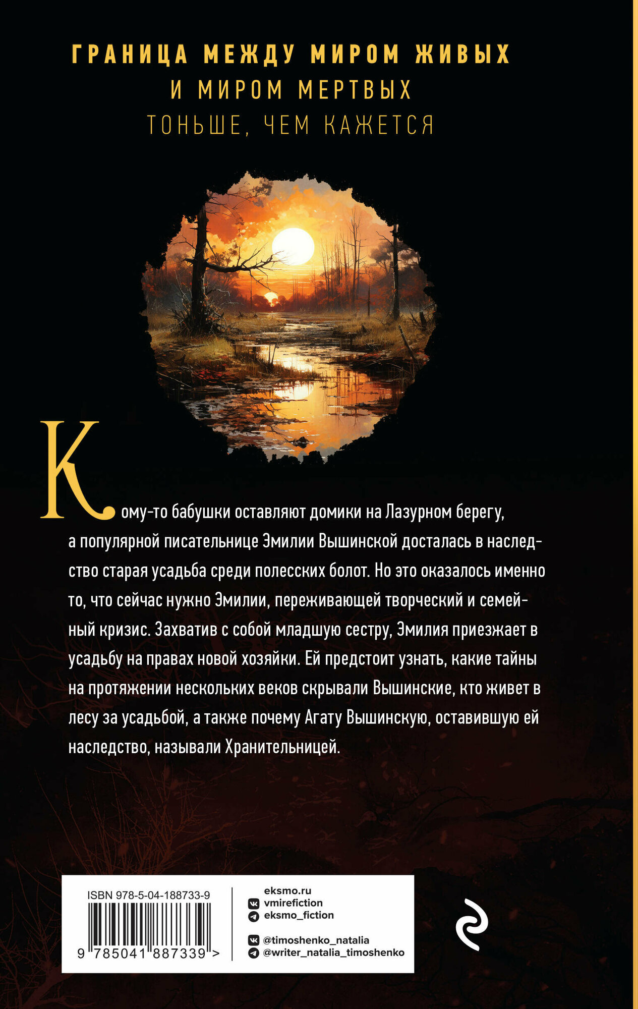 Кому-то бабушки оставляют домики на Лазурном берегу, а популярной писательнице Эмилии Вышинской досталась в наследство старая усадьба среди полесских болот. Но это оказалось именно то, что сейчас нужно Эмилии, переживающей творческий и семейный кризис. Захватив с собой младшую сестру, Эмилия приезжает в усадьбу на правах новой хозяйки. Ей предстоит узнать, какие тайны на протяжении нескольких веков скрывали Вышинские, кто живет в лесу за усадьбой, а также почему Агату Вышинскую, оставившую ей наследство, называли Хранительницей.
