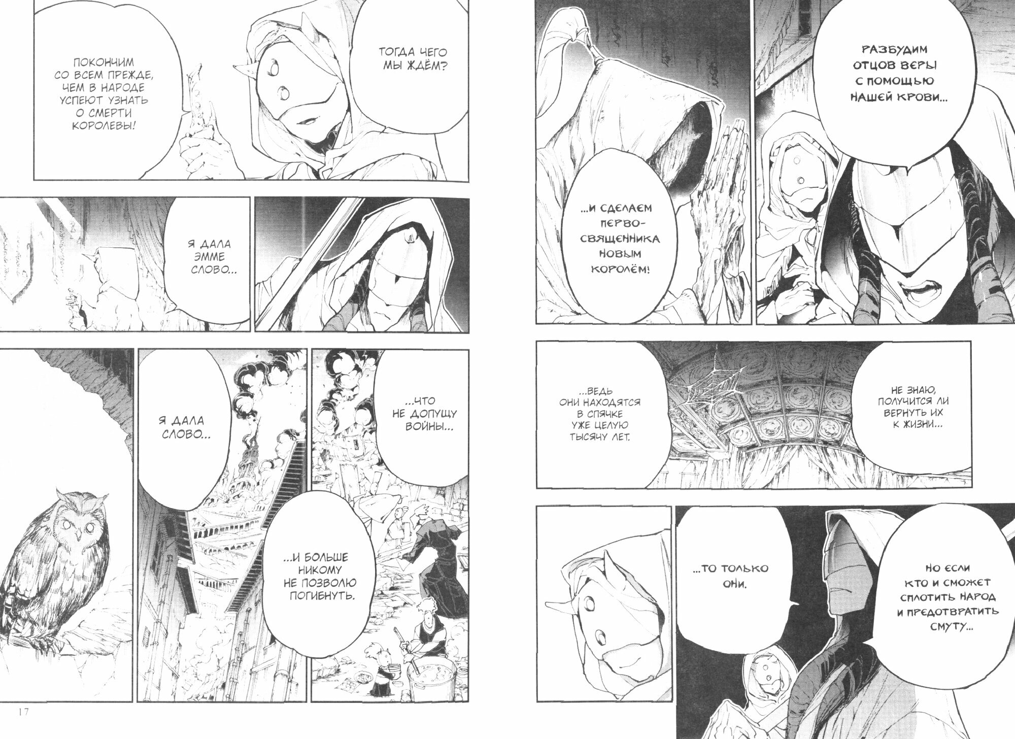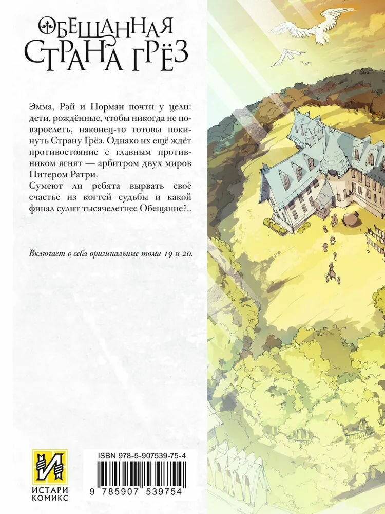 Эмма, Рэй и Норман почти у цели: дети, рождённые, чтобы никогда не повзрослеть, наконец-то готовы покинуть Страну Грёз. Однако их ещё ждёт противостояние с главным противником ягнят — арбитром двух миров Питером Ратри. Сумеют ли ребята вырвать своё счастье из когтей судьбы и какой финал сулит тысячелетнее Обещание?..Включает в себя оригинальные тома 19 и 20.