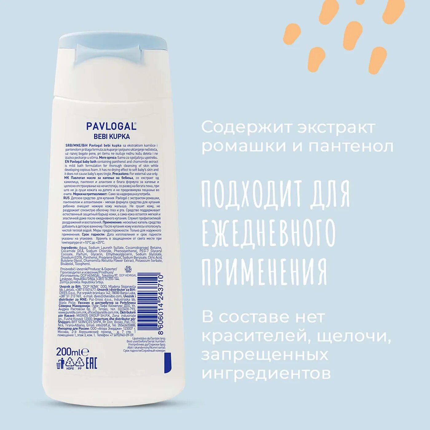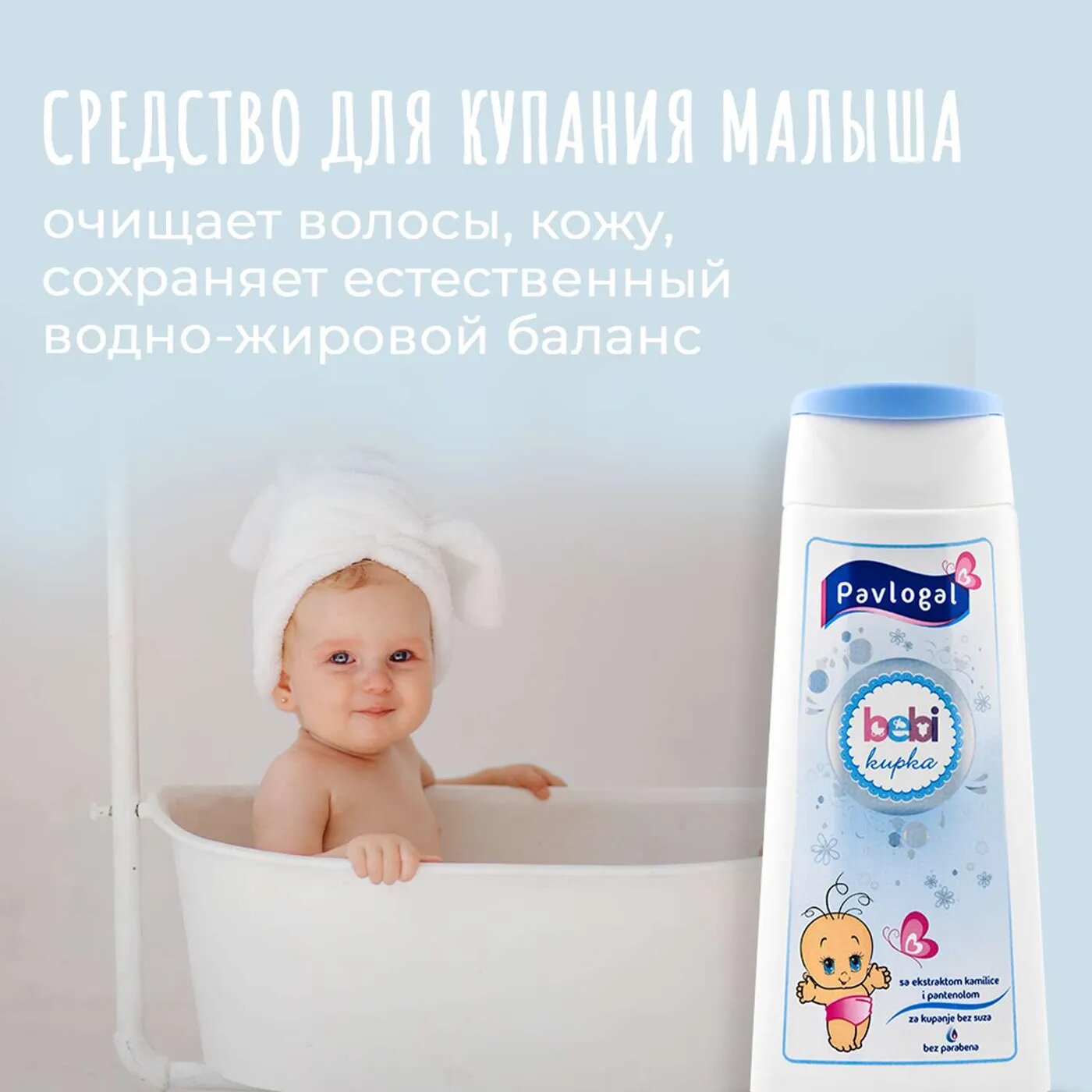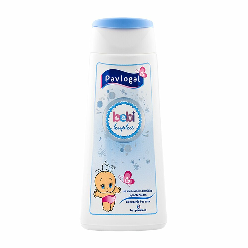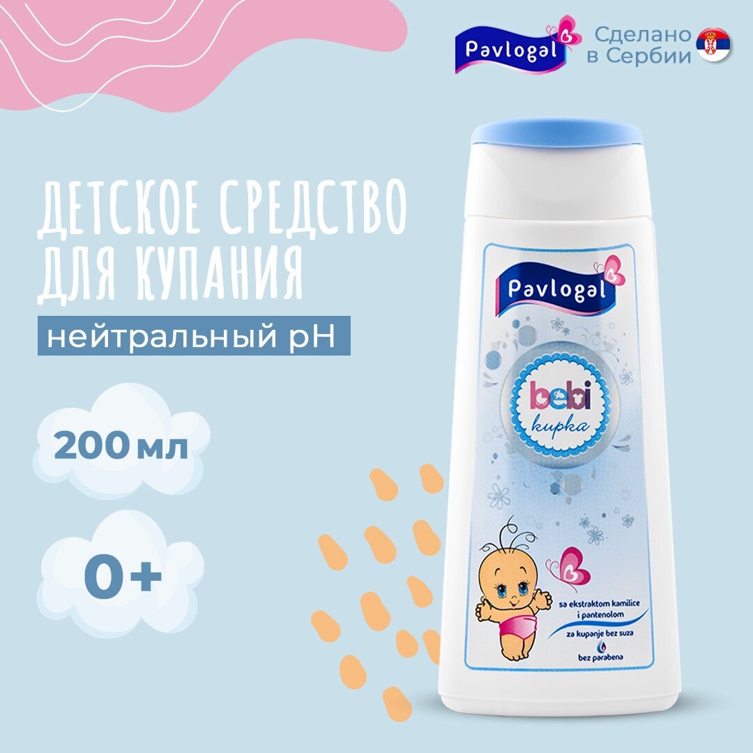 Средство для купания детей Pavlogal. Обладает нейтральным pH, сохраняет естественный водно-жировой баланс. Содержит экстракт ромашки и пантенол. В составе нет красителей, щелочи, запрещенных ингредиентов. Ухаживающие компоненты смягчают, увлажняют и успокаивают кожу, оказывают противовоспалительное и антисептическое действие. Средство для купания малыша очищает волосы, кожу, не щиплет глазки. Разрешено новорожденным с первых дней жизни. Сербское средство для купания Pavlogal подходит для ежедневного применения.