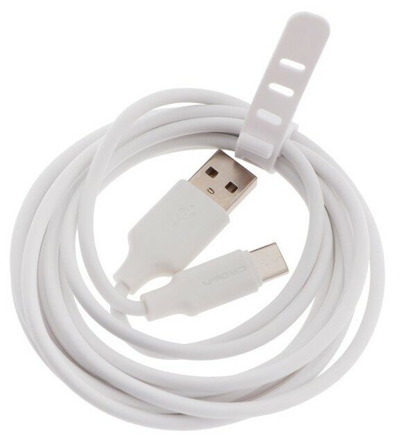 Удобный двухметровый кабель для зарядки устройств и передачи данных. Оплетка и коннекторы выполнены из ПВХ. На кабеле находится силиконовый ремешок, который удобно фиксирует кабель при скручивании.
