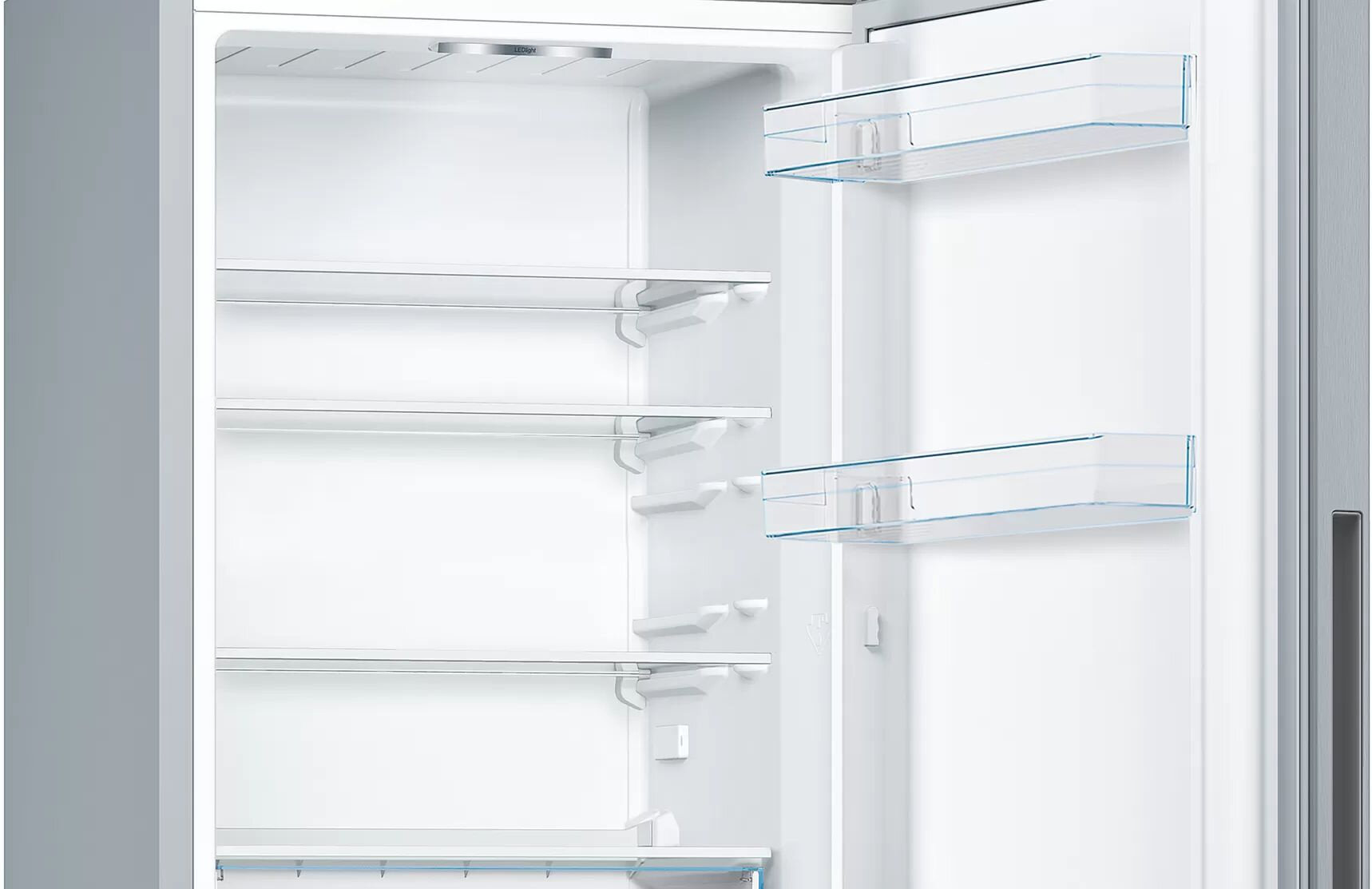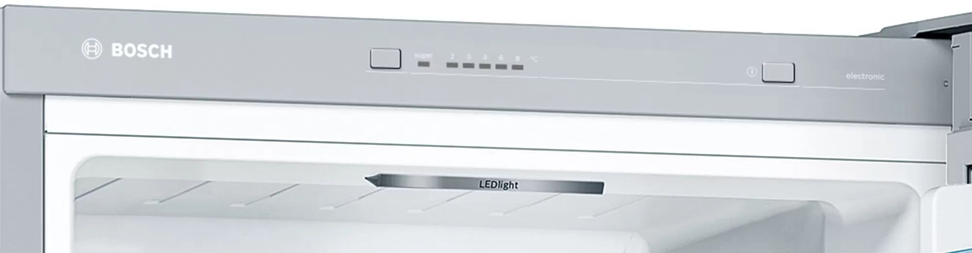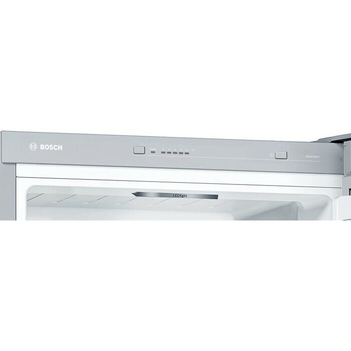 Холодильник Bosch имеет класс энергопотребления E и не оснащен дисплеем для управления. Однако он обладает зоной свежести - специальной зоной для более длительного сохранения свежести овощей и фруктов.