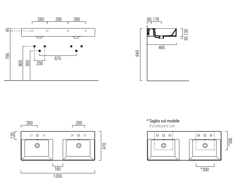 - Отверстие под смеситель: 1 готовое, 2 намеченных (для каждой чаши).