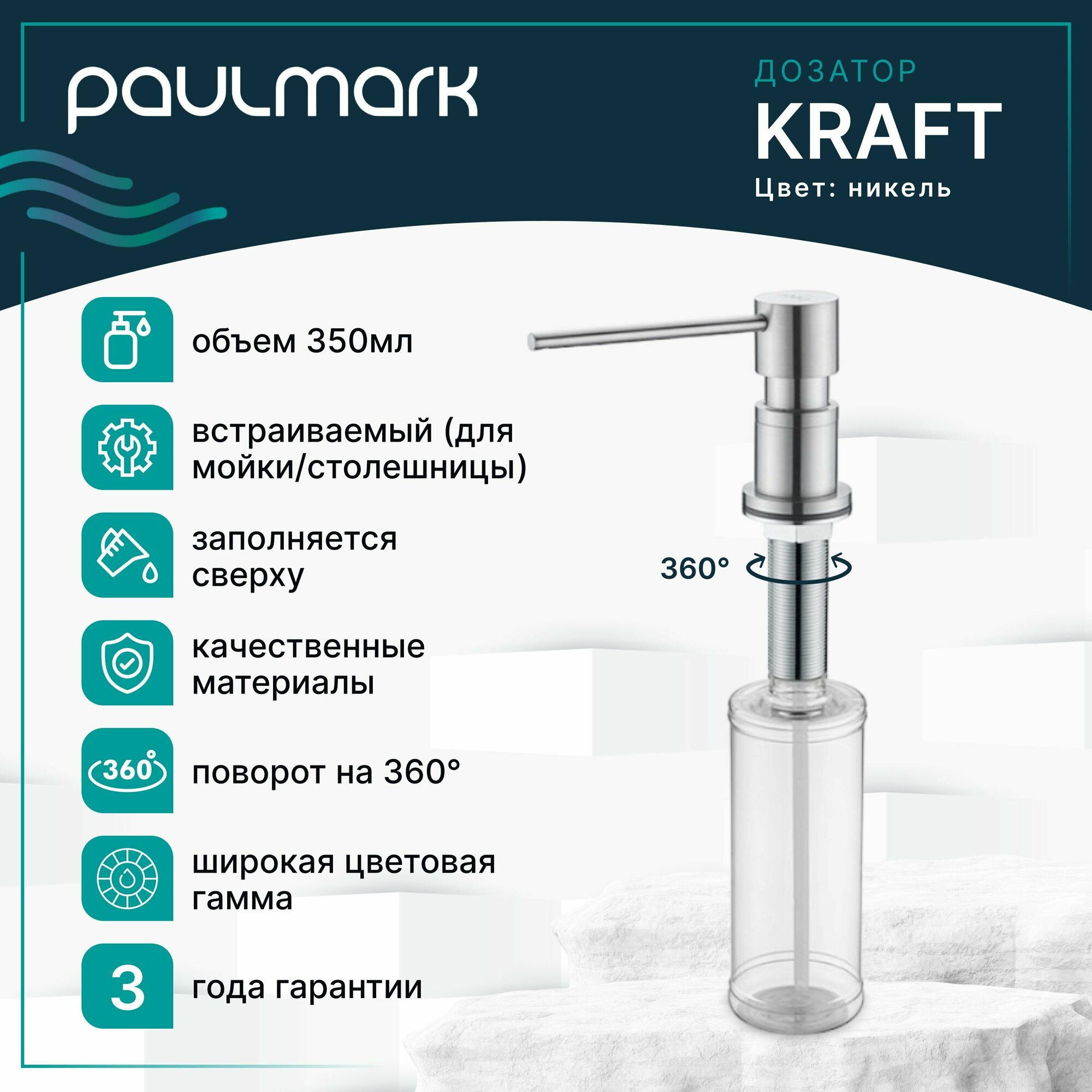Встраиваемый дозатор для кухни и ванной Paulmark KRAFTИспользование встраиваемого дозатора обеспечивает стильный внешний вид рабочего пространства, контроль и экономную подачу моющего средства (средства для рук). Простой и надежный пружинный механизм подачи моющего средства обеспечивает бесперебойную работу дозатора.Дозатор для кухни или ванной серии KRAFT устанавливается в столешницу, кухонную мойку с площадкой или в раковину в ванной комнате.Объем колбы 350 мл.Заправка моющим средством происходит без откручивания ёмкости. Для пополнения колбы моющим средством просто вытяните верхнюю часть дозатора движением вверх и залейте моющее средство в открывшуюся горловину колбы.Дозатор подходит для установки в столешницы толщиной до 47 мм.Рекомендуемый диаметр монтажного отверстия для установки дозатора – 35 мм. Материал: латунь и пластик.Носик дозатора поворачивается на 360°.Длина носика 100 мм, при установке необходимо учитывать расстояние дозатора до чаши мойки, чтобы конец носика дозатора располагался над мойкой.При выборе места для монтажа убедитесь, что размещению колбы под столешницей не будут мешать коммуникации.
