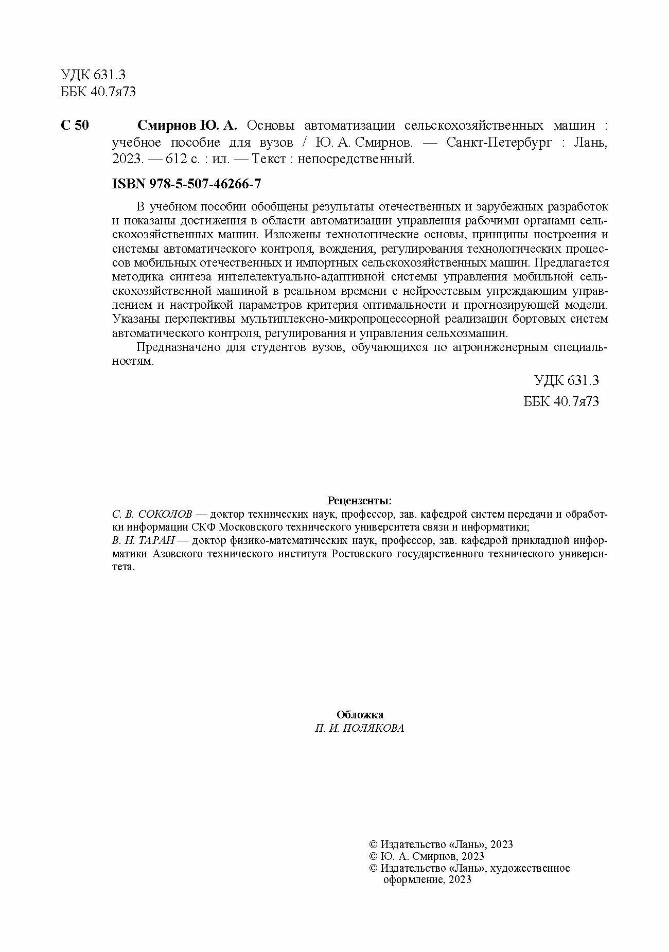 Основы автоматизации сельскохозяйственных машин. Учебное пособие для вузов (Ю. А. Смирнов); Издательство ЛАНЬ, 2023
