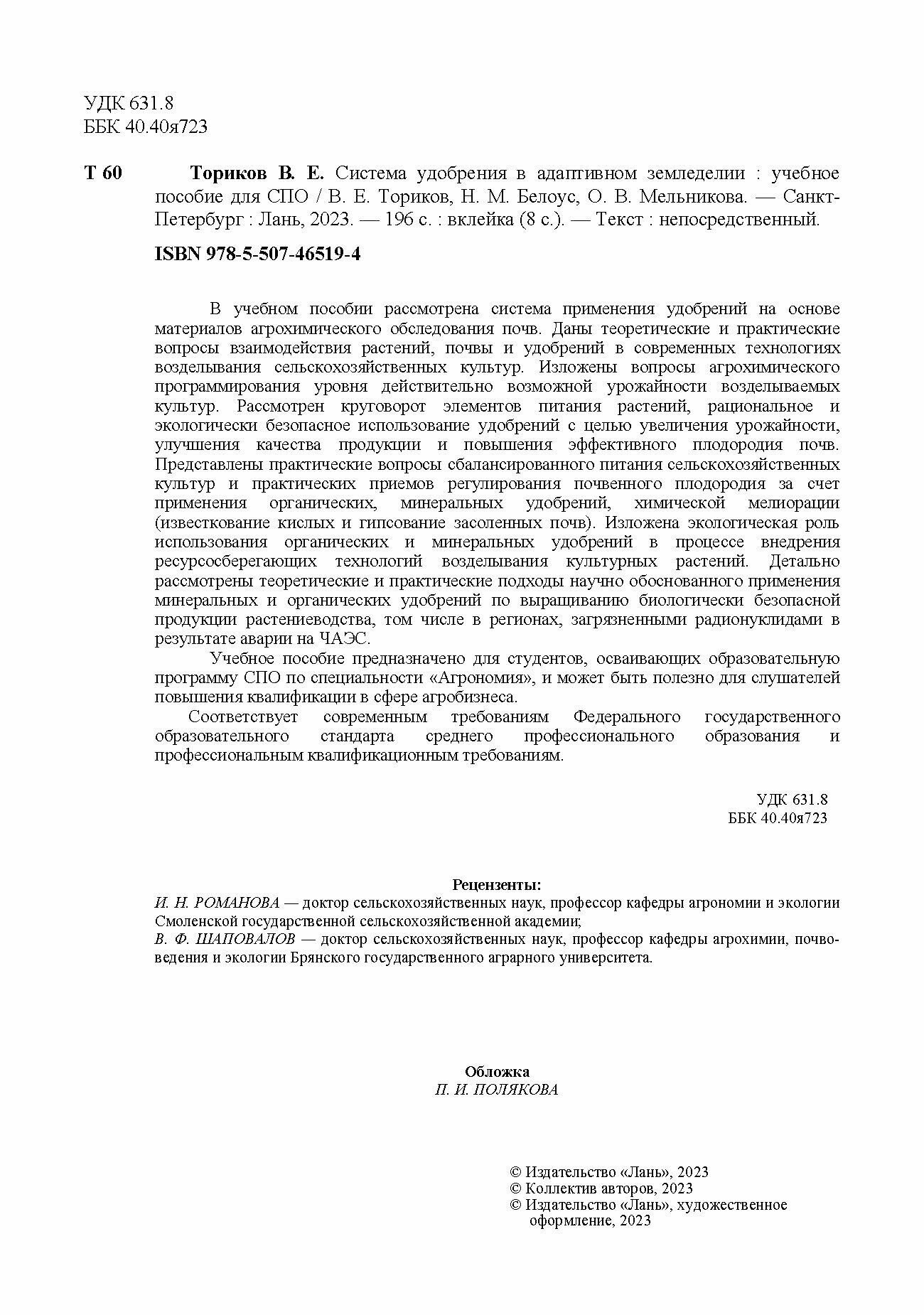 Система удобрения в адаптивном земледелии. Учебное пособие (О. В. Мельникова); Издательство ЛАНЬ, 2023