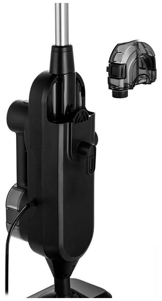 Стильная паровая швабра с функцией вертикальной парковки «2 в 1» КТ-1018 — универсальное и современное устройство, которое поможет избавиться от пыли и грязи с помощью мощной струи пара, а также продезинфицирует обрабатываемую поверхность. Швабра оснащена съёмным резервуаром для воды объёмом 300 мл, что позволяет производить непрерывную уборку до 19 мин. Предусмотрен фильтр для смягчения воды, устанавливаемый в ёмкость для воды. Он поможет в предотвращении образования накипи в бойлере. С помощью паровой швабры КТ-1018 можно проводить чистку пола и с моющим средством. Для этого устройство оснащено отдельным резервуаром ёмкостью 150 мл. На корпусе имеется специальный переключатель для подачи средства во время отпаривания. Три уровня подачи пара позволят настраивать интенсивность выходящего пара. Это очень удобно при очистке разных типов поверхностей с разным уровнем загрязнения. Чем сильнее загрязнение, тем больше пара потребуется. Индикация показывает выбранный режим. Съёмный ручной модуль паровой швабры удобно использовать с насадками. С их помощью можно легко отмыть окна, почистить шторы и мягкую мебель. Благодаря наличию парового шланга есть возможность добраться и очистить труднодоступные места. Скребок, латунная и нейлоновые щётки очищают сложные загрязнения за счёт механического воздействия. Для очистки окон, зеркал и кафельной плитки используется скребок для стекла с резиновой вставкой. Струйная и угловая насадки помогут очистить щели и углы. Тряпка для пола устанавливается на напольную щётку с помощью липучек. Её можно стирать в стиральной машине в тёплой воде. В комплекте есть рамка для ковра, которая обеспечивает лёгкое скольжение щётки во время чистки. Паровая швабра имеет большой угол наклона при уборке, который поможет легко убирать пространство под мебелью. Напольная щётка закреплена на специальном шаровом шарнире с наклоном в двух плоскостях, что делает швабру очень маневренной и облегчает уборку. При хранении швабра не займёт много места. Шнур длиной 5 м не сковывает и не ограничивает ваше перемещение во время уборки. На ручке и корпусе швабры имеются держатели для смотки шнура.