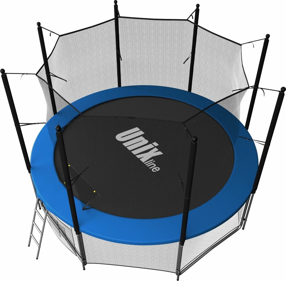 Помимо верхней защитной сетки, все батуты модельного ряда UNIX Line оборудованы нижней защитной сеткой, которая препятствует проникновению под прыжковое полотно батута детей, животных, а так же попаданию посторонних предметов, и лестницей для удобства пользования. А в моделях диаметром от 10FT (305см.), в комплект входят специальные крепления батута к земле (колышки).