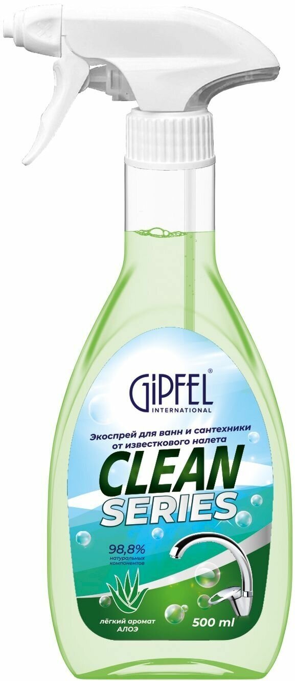 Экоспрей для ванн и сантехники Gipfel Clean Series от известкового налета 52305. В прозрачной бутылке с дозатором 500 мл средства.